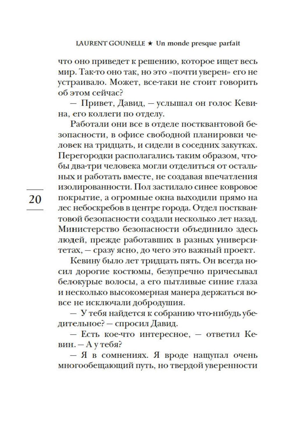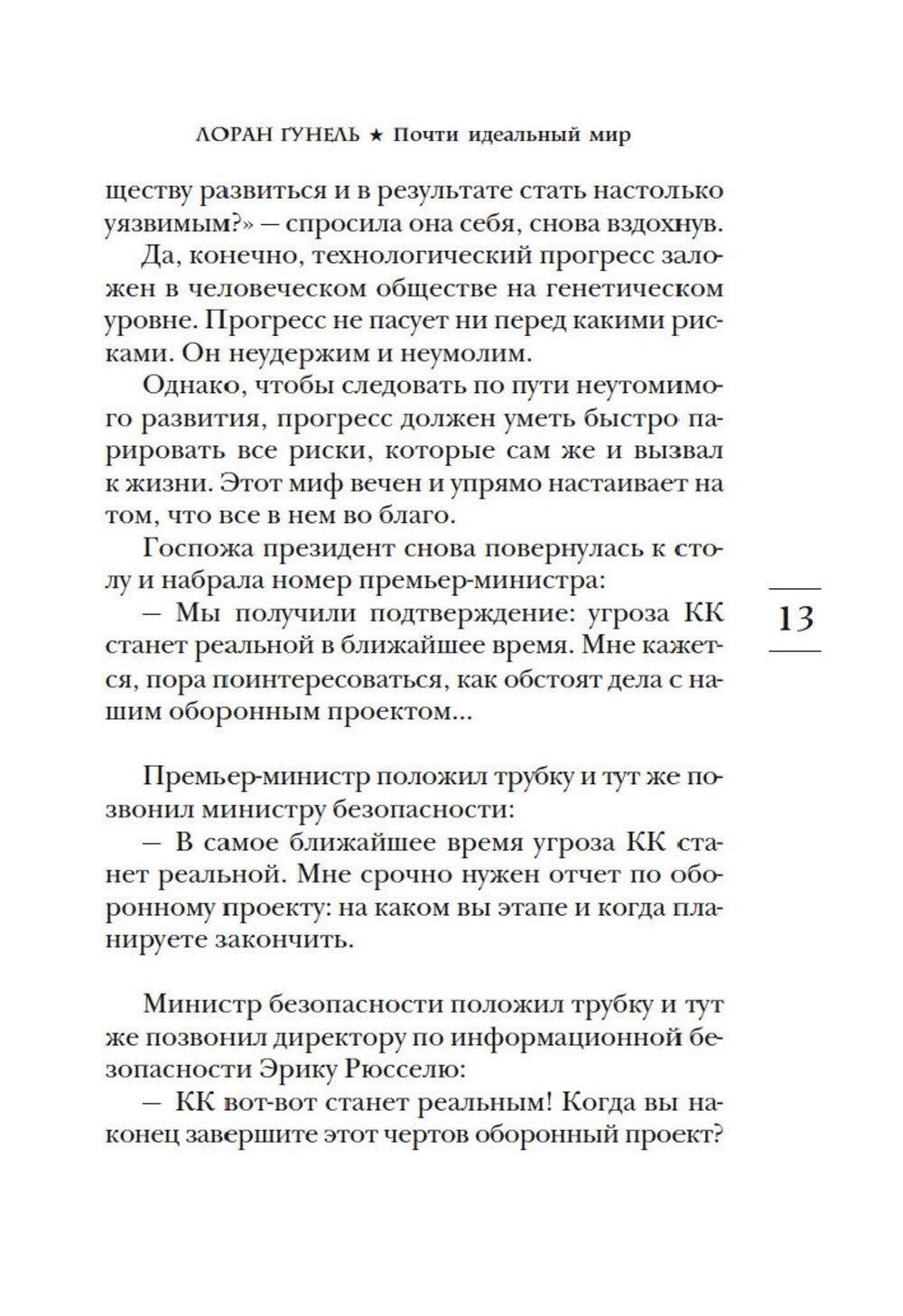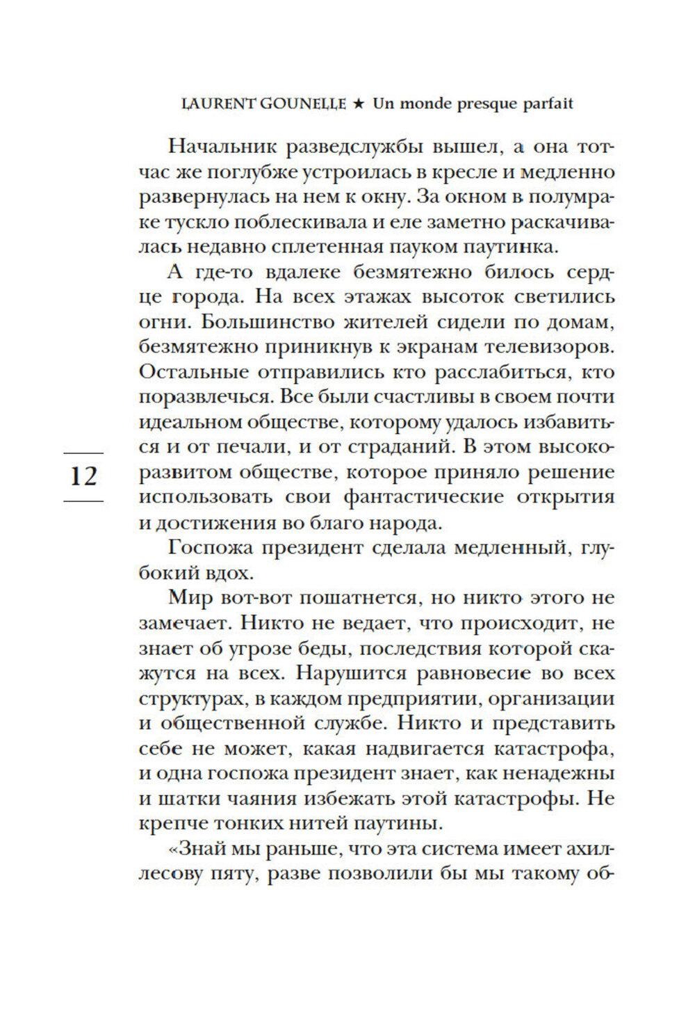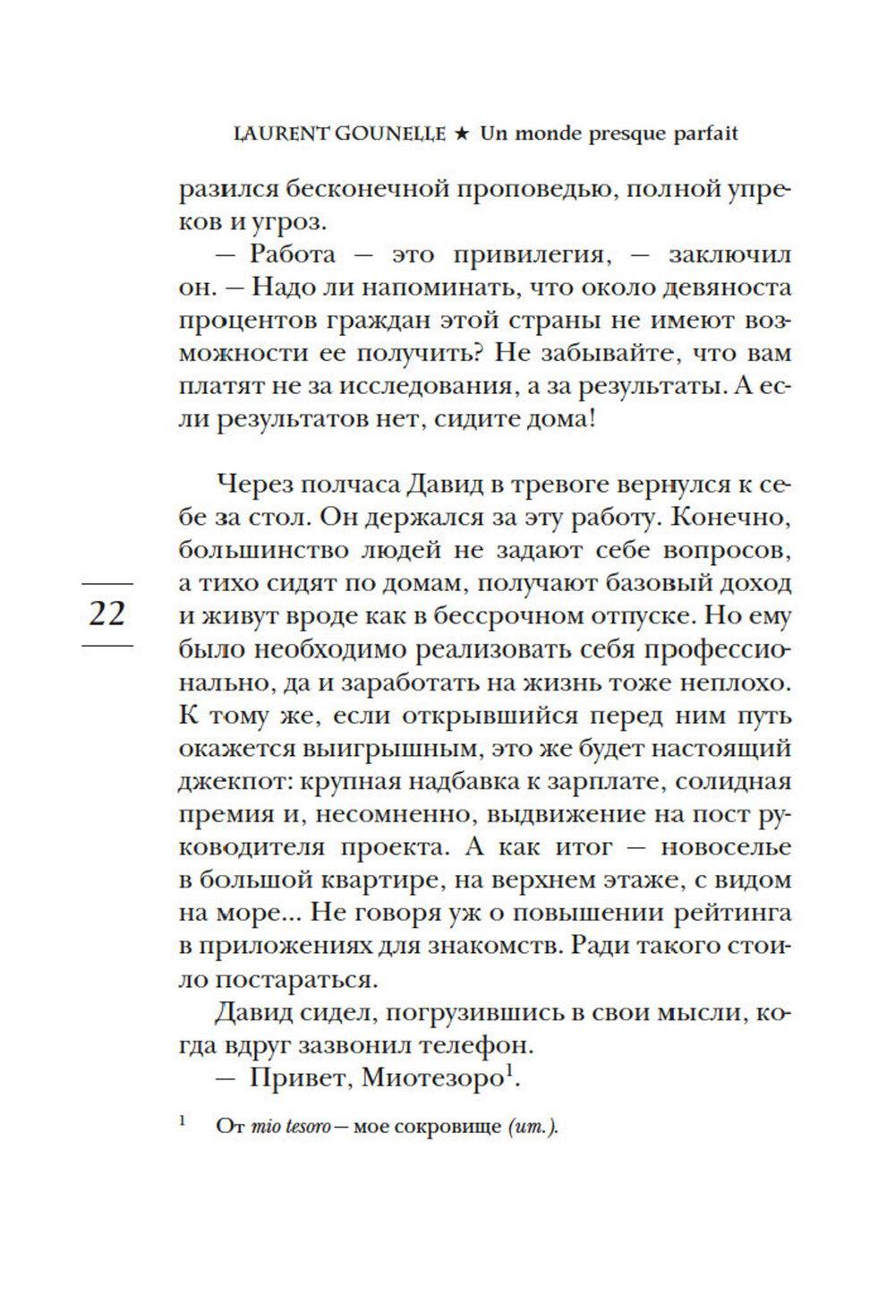 СОДЕРЖИТ ИНФОРМАЦИЮ О НАРКОТИЧЕСКИХ ИЛИ ПСИХОТРОПНЫХ ВЕЩЕСТВАХ, УПОТРЕБЛЕНИЕ КОТОРЫХ ОПАСНО ДЛЯ ЗДОРОВЬЯ. ИХ НЕЗАКОННЫЙ ОБОРОТ ВЛЕЧЕТ УГОЛОВНУЮ ОТВЕТСТВЕННОСТЬ. Мир, в котором живет программист Давид Лизнер, раскололся надвое. С одной стороны - высокоразвитое общество Правильных: они избавлены от болезней, бедности и сомнений, не обязаны работать, никогда не расстаются с телефонами, получают бонусы, если исправно выполняют рекомендации многочисленных мобильных приложений, и рискуют оказаться на обочине, если перестают слушаться. Большинство довольны такой жизнью, хотя счастливы ли - вопрос открытый. С другой стороны - Изгои; не смирившись с тотальным технологическим порабощением и информационным контролем, они переселились на остров, куда Правильные предпочитают не соваться. Давиду, впрочем, придется. Он должен сообщить девушке по имени Эва Монтойя, что у нее умер дядя, великий социолог, и добыть его последнюю научную работу, которая грозит подорвать устои почти идеального мира, в котором Давиду так комфортно. Однако свободолюбивая Эва задает массу неудобных вопросов, и постепенно Давид и сам начинает недоумевать. А почему, собственно говоря, он обязан покорно подстраиваться под чужие ожидания?.. С выхода первых же своих романов Лоран Гунель, специалист по психологии развития личности, прочно вошел в пятерку самых популярных французских беллетристов. Он автор десяти книг, переведенных на сорок языков, его произведения стоят в одном ряду с книгами Марка Леви и Гийома Мюссо. Его новый роман «Почти идеальный мир» - наглядная, прозрачная история о том, что происходит, когда люди ради повседневного комфорта отдают свое право выбора властям или алгоритмам. Наша жизнь принадлежит только нам. Только мы решаем, какой она будет и в целом, и в мелочах. Давайте не будем отказываться от своего права решать самим. И пусть новый роман Лорана Гунеля нас вдохновляет.| Издательство | Азбука |