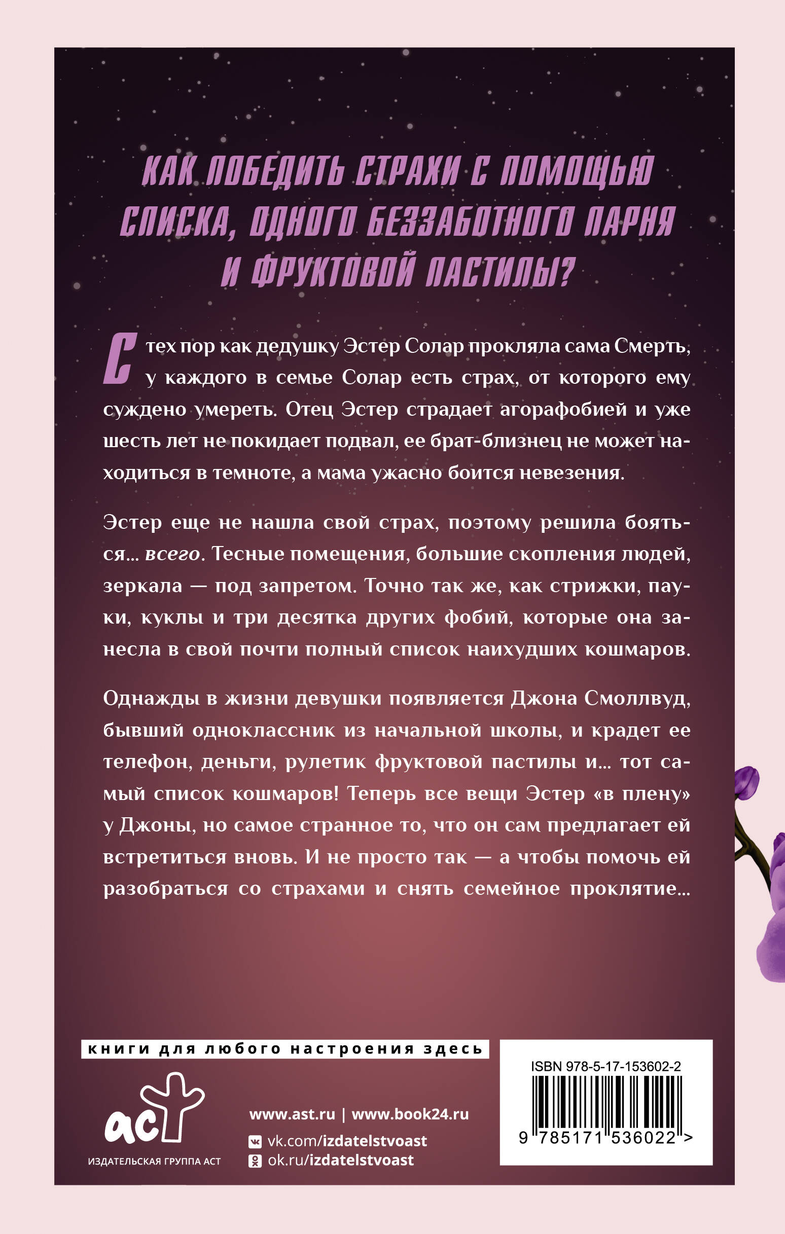 C тех пор как дедушку Эстер Солар прокляла сама Смерть, у каждого в семье Солар есть страх, от которого ему суждено умереть. Отец Эстер страдает агорафобией и уже шесть лет не покидает подвал, ее брат-близнец не может находиться в темноте, а мама ужасно боится невезения. Эстер еще не нашла свой страх, поэтому решила бояться… всего. Тесные помещения, большие скопления людей, зеркала - под запретом. Точно так же, как стрижки, пауки, куклы и три десятка других фобий, которые она занесла в свой почти полный список наихудших кошмаров. Однажды в жизни девушки появляется Джона Смоллвуд, бывший одноклассник из начальной школы, и крадет ее телефон, деньги, рулетик фруктовой пастилы и… тот самый список кошмаров! Теперь все вещи Эстер "в плену" у Джоны, но самое странное то, что он сам предлагает ей встретиться вновь. И не просто так - а чтобы помочь ей разобраться со страхами и снять семейное проклятие…| Издательство | ИЗДАТЕЛЬСТВО "АСТ" |