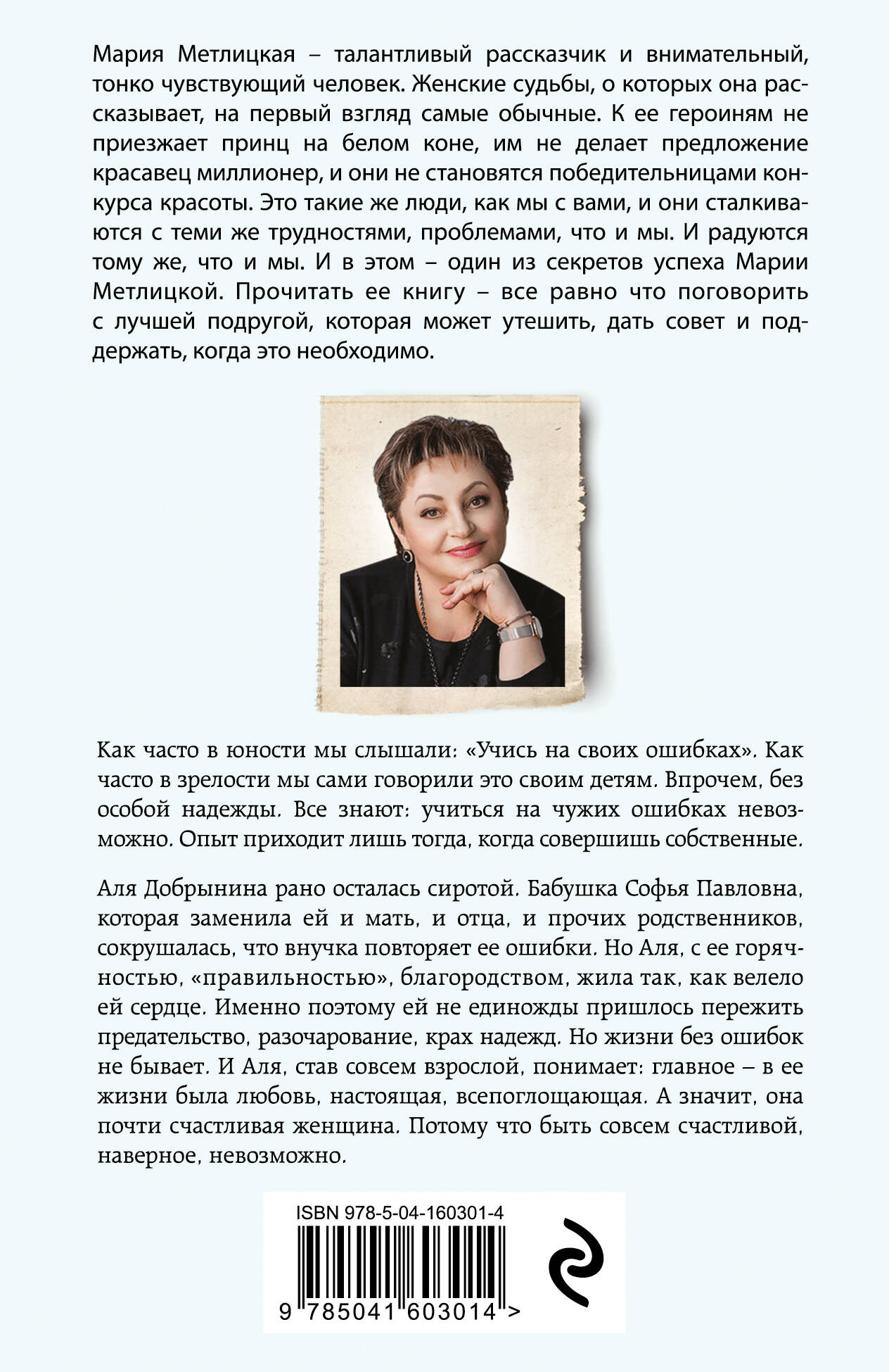 Мария Метлицкая размышляет о вечных темах: что такое счастье и возможно ли прожить жизнь без ошибок. Аля Добрынина рано осталась сиротой. Бабушка Софья Павловна, которая заменила ей и мать, и отца, и прочих родственников, сокрушалась, что внучка буквально повторяет ее ошибки, словно повторяет непройденное. Но Аля, с ее горячностью, «правильностью», благородством, жила так, как велело ей сердце. Именно поэтому ей не однажды пришлось пережить предательство, разочарование, крах надежд. Но жизни без ошибок не бывает. И Аля, став совсем взрослой, понимает: главное - в ее жизни была любовь, настоящая, всепоглощающая. А значит, она почти счастливая женщина. Потому что быть совсем счастливой, наверное, невозможно.| Издательство | ООО "Издательство "Эксмо" |