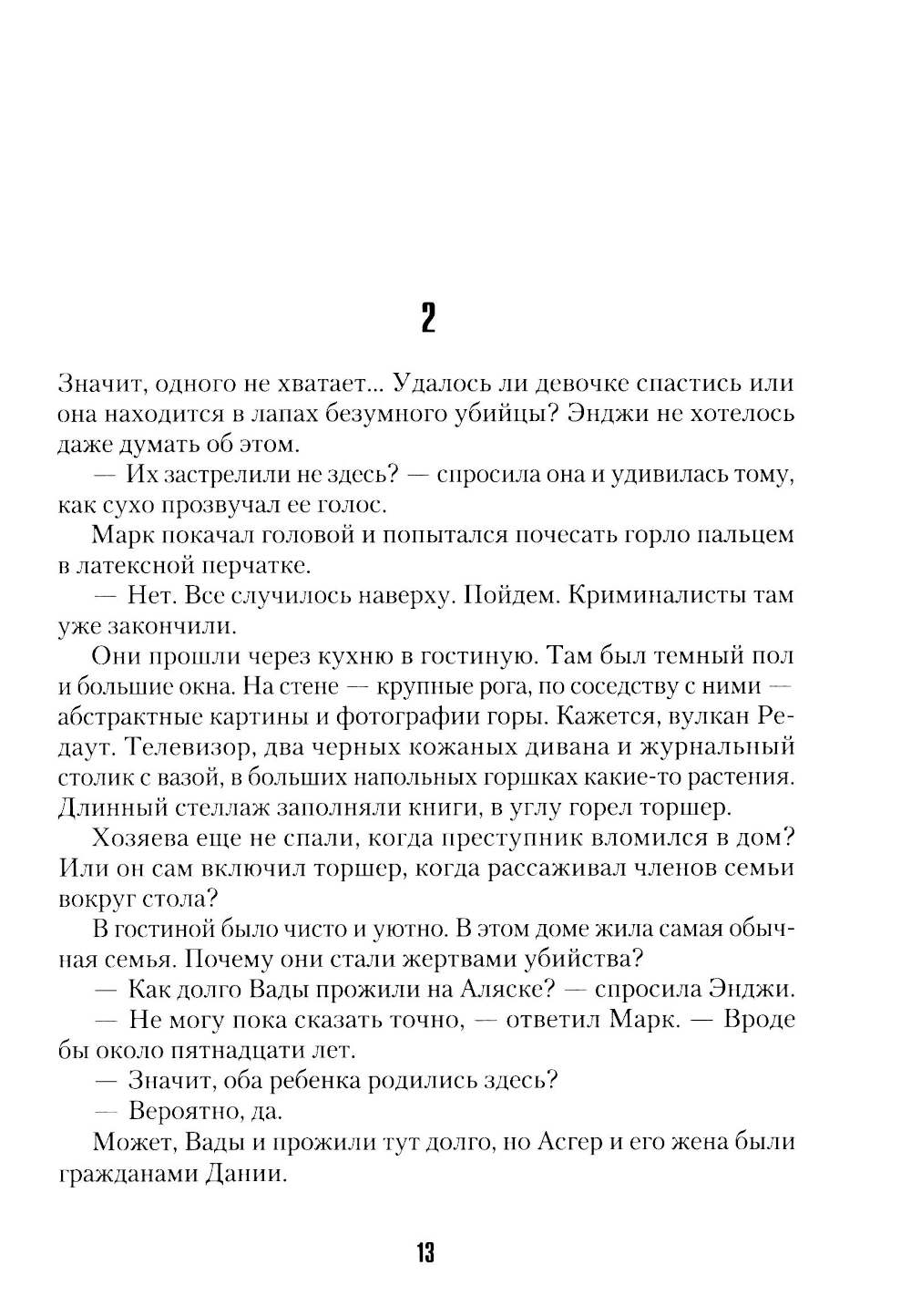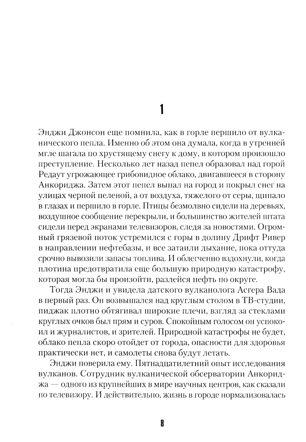 Новое дело комиссара криминальной полиции Дэниеля Трокича, известного читателям по книгам «Собиратель ос» и «Мороз и пепел». На этот раз трагедия разворачивается на фоне заснеженных пейзажей Аляски. Комиссар Трокич отправляется из Орхуса в Анкоридж для помощи в расследовании убийства семьи датского вулканолога. Асгер Вад, его жена и сын найдены застреленными в доме на окраине города. Убийца разместил жертв вокруг стола, на который поставил кукольный домик с четырьмя маленькими куклами и насыпал кучку вулканического пепла. Однако за столом не хватает одного человека. Одиннадцатилетняя дочь семьи Вад исчезла. Она сбежала или ее забрал убийца?.. В Анкоридже Трокич объединится с местной полицейской Энджи Джонсон, и начнется их совместная охота на безумного преступника и поиски пропавшей девочки-подростка.| Издательство | Фолиант |