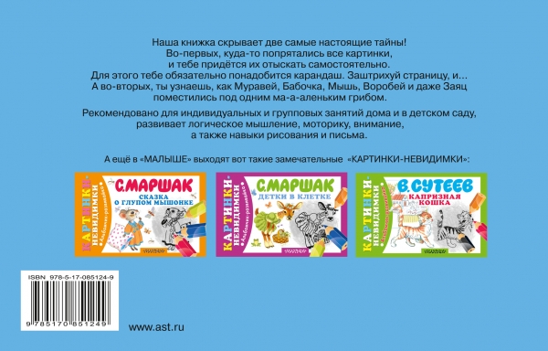 Наша книжка скрывает две самые настоящие тайны! Во-первых, куда-то попрятались все картинки, и тебе придётся их отыскать самостоятельно. Для этого тебе обязательно понадобится карандаш. Заштрихуй страницу, и… А во-вторых, ты узнаешь, как Муравей, Бабочка, Мышь, Воробей и даже Заяц поместились под одним ма-а-аленьким грибом.