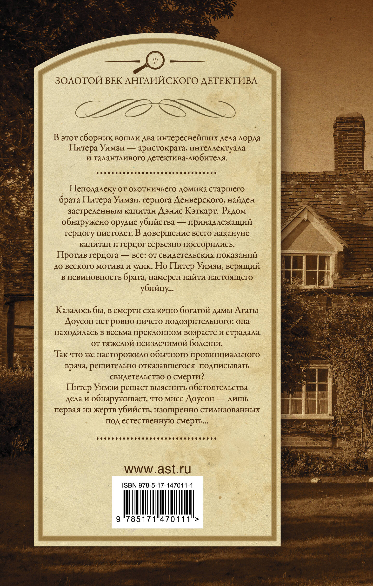 В этот сборник вошли два интереснейших дела лорда Питера Уимзи - аристократа, интеллектуала и талантливого детектива-любителя. Неподалеку от охотничьего домика старшего брата Питера Уимзи, герцога Денверского, найден застреленным капитан Дэнис Кэткарт. Рядом обнаружено орудие убийства - принадлежащий герцогу пистолет. В довершение всего накануне капитан и герцог серьезно поссорились. Против герцога - все: от свидетельских показаний до веского мотива и улик. Но Питер Уимзи, верящий в невиновность брата, намерен найти настоящего убийцу... Казалось бы, в смерти сказочно богатой дамы Агаты Доусон нет ровно ничего подозрительного: она находилась в весьма преклонном возрасте и страдала от тяжелой неизлечимой болезни. Так что же насторожило обычного провинциального врача, решительно отказавшегося подписывать свидетельство о смерти? Питер Уимзи решает выяснить обстоятельства дела и обнаруживает, что мисс Доусон - лишь первая из жертв убийств, изощренно стилизованных под естественную смерть...| Издательство | АСТ |