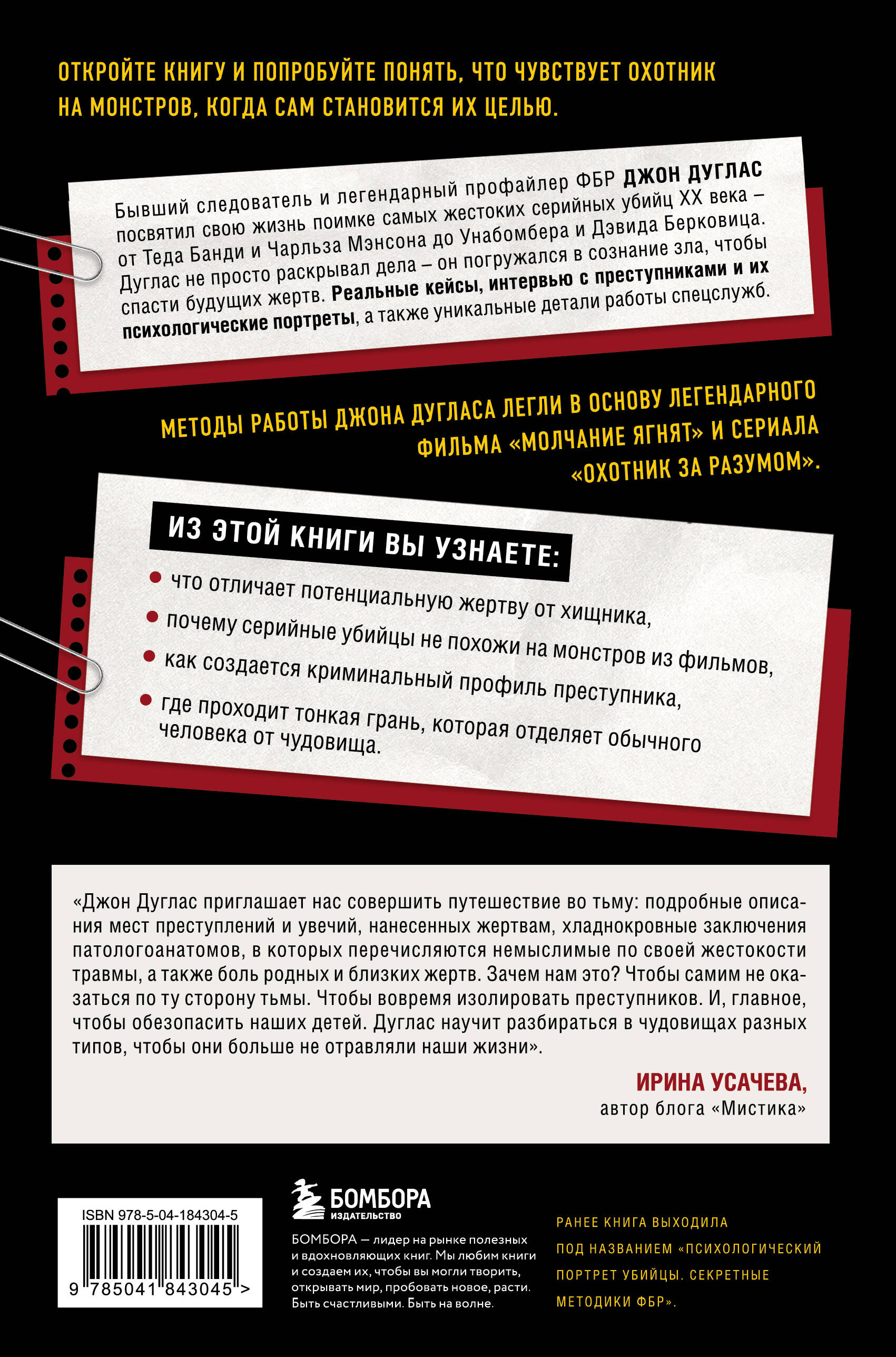 Откройте книгу и попробуйте понять, что чувствует охотник на монстров, когда сам становится их целью. Бывший следователь и легендарный профайлер ФБР Джон Дуглас посвятил свою жизнь поимке самых жестоких серийных убийц XX века - от Теда Банди и Чарльза Мэнсона до Унабомбера и Дэвида Берковица. Дуглас не просто раскрывал дела - он погружался в сознание зла, чтобы спасти будущих жертв. В этой книге, впервые опубликованной еще в 1995 году, вы найдете реальные кейсы, интервью с преступниками и их психологические портреты, а также захватывающие подробности преступлений и уникальные детали работы спецслужб. Методы работы Джона Дугласа легли в основу легендарного фильма «Молчание ягнят» и сериала «Охотник за разумом». ВЫ УЗНАЕТЕ: - что отличает потенциальную жертву от хищника; - почему серийные убийцы не похожи на монстров из фильмов; - как создается криминальный профиль преступника; - где проходит тонкая грань, которая отделяет обычного человека от чудовища. Ранее книга выходила под названием «Психологический портрет убийцы. Секретные методики ФБР». Об авторе Джон Дуглас - один из первых криминальных профайлеров, бывший специальный агент и начальник отдела следственной поддержки Национального центра анализа насильственных преступлений Федерального бюро расследований. За 25 лет работы в Отделе содействия расследованиям стал легендой ФБР, первым начав беседовать с серийными убийцами, чтобы понять их мотивы, привычки и слабости, тем самым заложив основы криминального профилирования. В своих книгах делится информацией о том, как устроены мозг и сознание убийц, чтобы развеять мифы вокруг них и дать возможность читателям защитить себя и окружающих от возможного появления новых жестоких преступников.| Издательство | ООО "Издательство "Эксмо" |