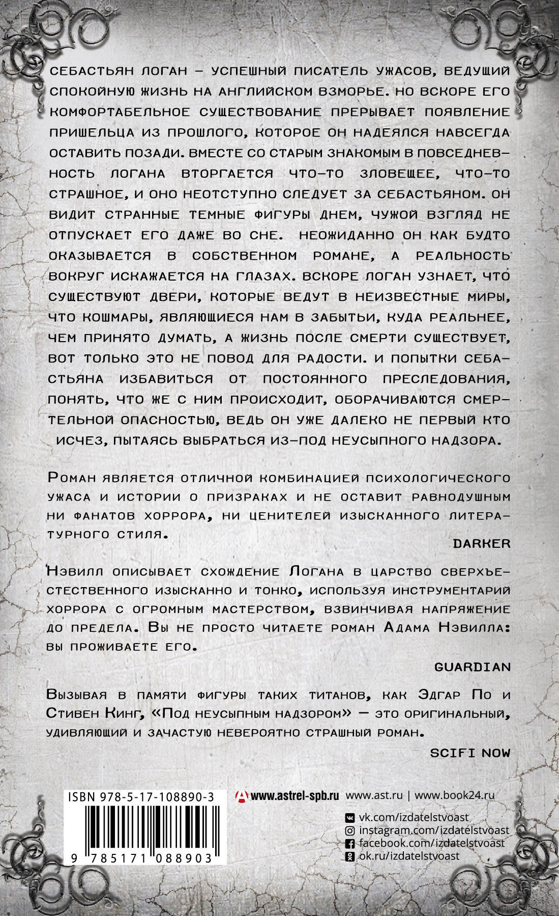 Адам Нэвилл, автор культового романа «Ритуал», на сегодняшний день стал одним из самых продаваемых авторов в жанре хоррора, уступая по тиражам и популярности разве что Стивену Кингу да Клайву Баркеру. Его новый роман «Под неусыпным надзором» - самое личное и зловещее произведение автора. Тихая жизнь Себастьяна Логана, успешного писателя, творящего в жанре ужасов, трещит по швам, когда в его доме появляется зловещий и совсем нежеланный гость из далёкого прошлого, которое Себ надеялся навсегда оставить позади. Вместе с пришельцем в его жизнь вторгается нечто жуткое и страшное, неотступно следующее и неусыпно следящее за Себастьяном. Писатель вдруг ощущает себя героем собственного романа, но что, если попытка вырваться из кошмара приведёт лишь к ещё большей трагедии? Нэвилл мастерски нагнетает атмосферу ужаса и обречённости, лихо закручивает сюжет и жестоко обманывает читательские ожидания, заставляя в нетерпении перелистывать страницу за страницей вплоть до самого финала.| Издательство | ИЗДАТЕЛЬСТВО "АСТ" |