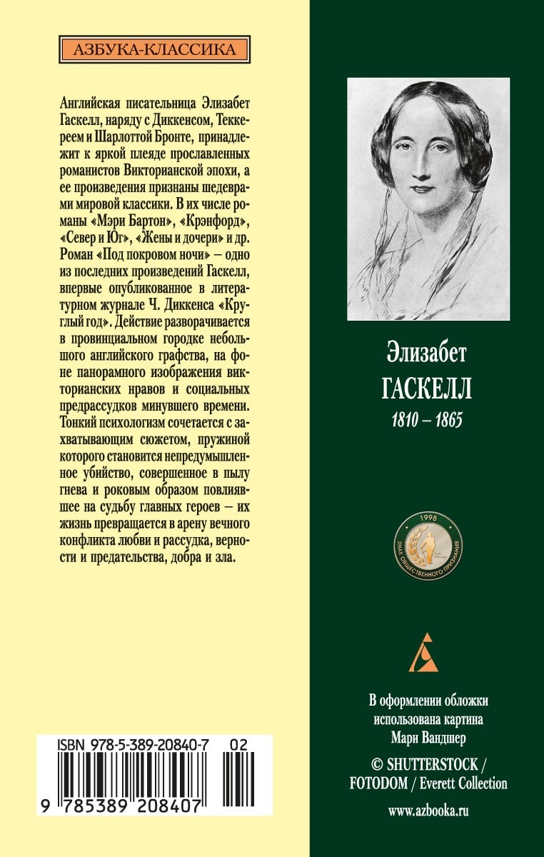Английская писательница Элизабет Гаскелл (1810-1865), наряду с Диккенсом, Теккереем и Шарлоттой Бронте, принадлежит к яркой плеяде прославленных романистов викторианской эпохи, а ее произведения признаны шедеврами мировой классики. В их числе романы «Мэри Бартон», «Крэнфорд», «Север и Юг», «Жены и дочери» и др. Роман «Под покровом ночи» (1863) на русском языке публикуется впервые. Действие разворачивается в провинциальном городке небольшого английского графства, на фоне панорамного изображения викторианских нравов и социальных предрассудков минувшего времени. Тонкий психологизм сочетается с захватывающим сюжетом, пружиной которого становится непредумышленное убийство, совершенное в пылу гнева и роковым образом повлиявшее на судьбу главных героев - их жизнь превращается в арену вечного конфликта любви и рассудка, верности и предательства, добра и зла.| Издательство | Азбука |