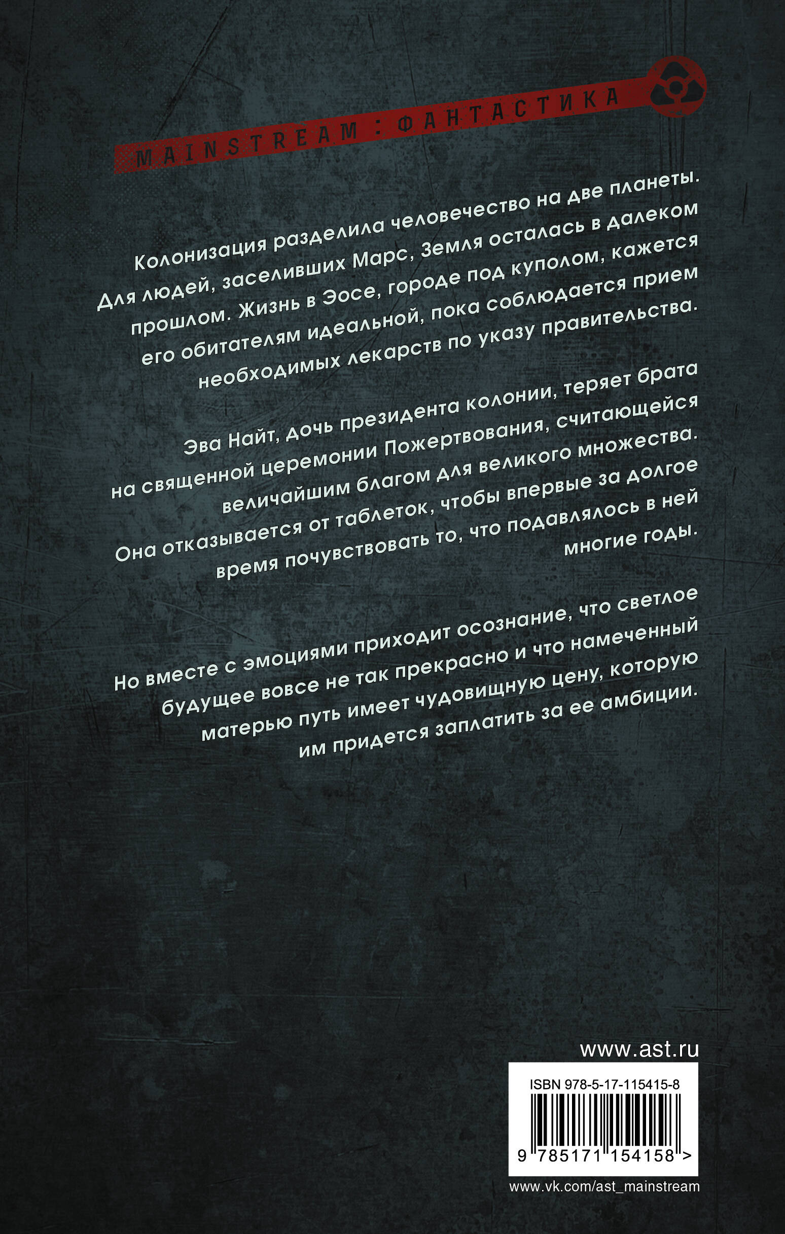 Колонизация разделила человечество на две планеты. Для людей, заселивших Марс, Земля осталась в далеком прошлом. Жизнь в Эосе, городе под куполом, кажется его обитателям идеальной, пока соблюдается прием необходимых лекарств по указу правительства. Эва Найт, дочь президента колонии, теряет брата на священной церемонии Пожертвования, считающейся величайшим благом для великого множества. Она отказывается от таблеток, чтобы впервые за долгое время почувствовать то, что подавлялось в ней многие годы. Но вместе с эмоциями приходит осознание, что светлое будущее вовсе не так прекрасно и что намеченный матерью путь имеет чудовищную цену, которую им придется заплатить за ее амбиции.| Издательство | АСТ |