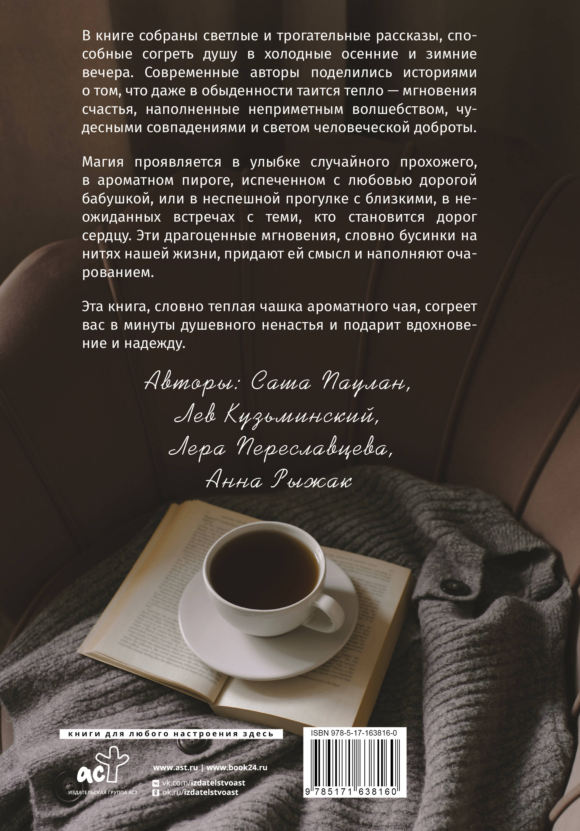 В книге собраны светлые и трогательные рассказы, способные согреть душу в холодные осенние и зимние вечера. Современные авторы поделились историями о том, что даже в обыденности таится тепло - мгновения счастья, наполненные неприметным волшебством, чудесными совпадениями и светом человеческой доброты. Магия проявляется в улыбке случайного прохожего, в ароматном пироге, испеченном с любовью дорогой бабушкой, или в неспешной прогулке с близкими, в неожиданных встречах с теми, кто становится дорог сердцу. Эти драгоценные мгновения, словно бусинки на нитях нашей жизни, придают ей смысл и наполняют очарованием. Эта книга, словно теплая чашка ароматного чая, согреет вас в минуты душевного ненастья и подарит вдохновение и надежду.| Издательство | Издательство "АСТ" |