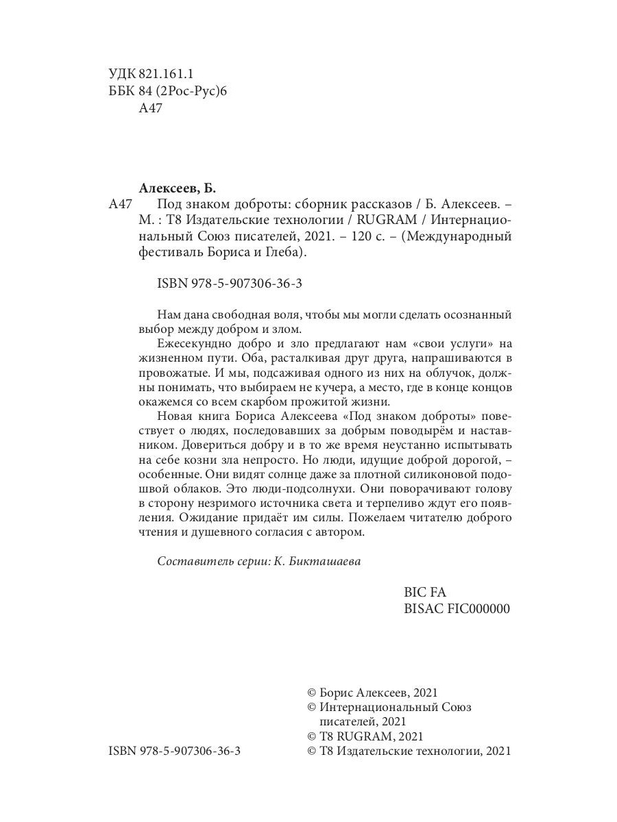 Нам дана свободная воля, чтобы мы могли сделать осознанный выбор между добром и злом. Ежесекундно добро и зло предлагают нам «свои услуги» на жизненном пути. Оба, расталкивая друг друга, напрашиваются в провожатые. И мы, подсаживая одного из них на облучок, должны понимать, что выбираем не кучера, а место, где в конце концов окажемся со всем скарбом прожитой жизни. Новая книга Бориса Алексеева «Под знаком доброты» повествует о людях, последовавших за добрым поводырём и наставником. Довериться добру и в то же время неустанно испытывать на себе козни зла непросто. Но люди, идущие доброй дорогой, -особенные. Они видят солнце даже за плотной силиконовой подошвой облаков. Это люди-подсолнухи. Они поворачивают голову в сторону незримого источника света и терпеливо ждут его появления. Ожидание придаёт им силы. Пожелаем читателю доброго чтения и душевного согласия с автором.| Издательство | Т8 RUGRAM |