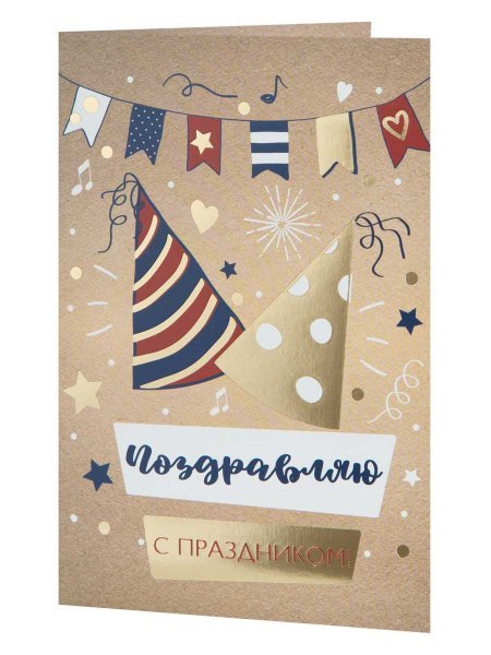 Подарочная открытка Поздравляю с праздником с книжной раскладкой с технологией из мелованного картона 235 р, цветность 4+4, дизайн с присутствием золотого тиснения, уф лак. 18,3х12,1см арт.82744