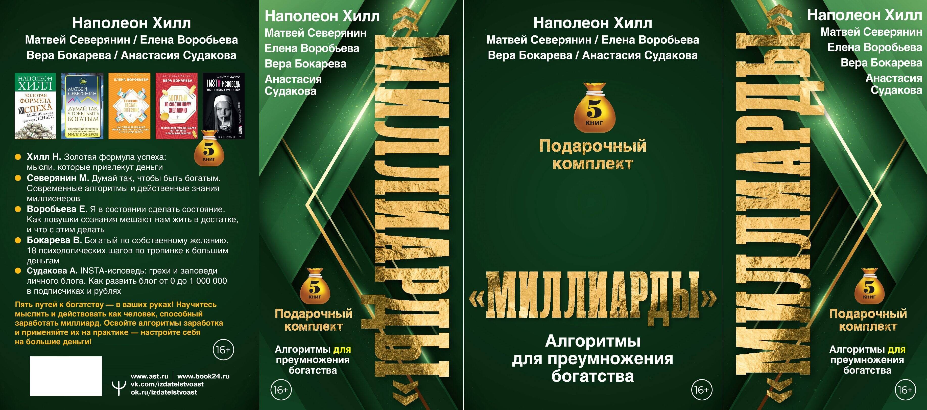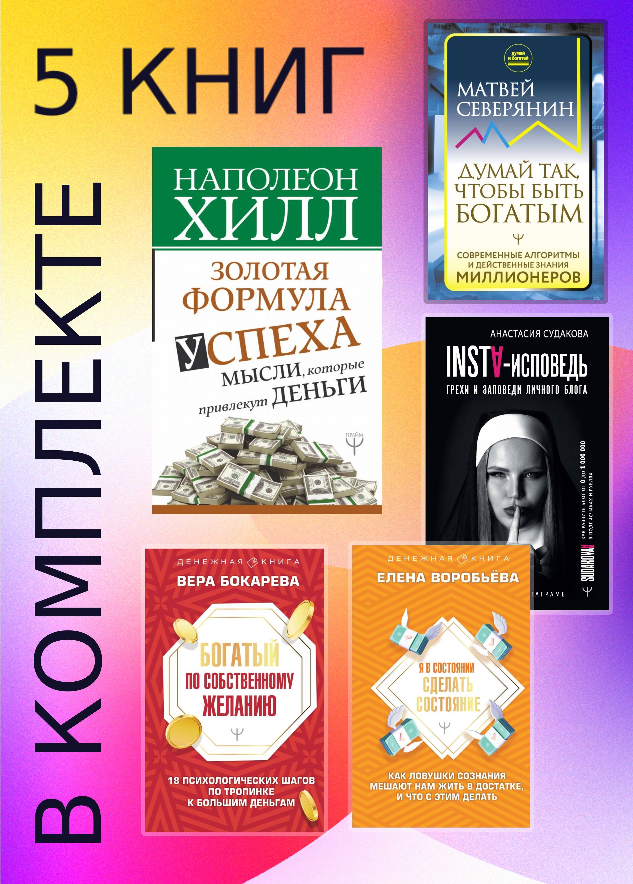 • Хилл Н. Золотая формула успеха: мысли, которые привлекут деньги • Северянин М. Думай так, чтобы быть богатым. Современные алгоритмы и действенные знания миллионеров • Воробьева Е. Я в состоянии сделать состояние. Как ловушки сознания мешают нам жить в достатке, и что с этим делать • Бокарева В. Богатый по собственному желанию. 18 психологических шагов по тропинке к большим деньгам • Судакова А. INSTA-исповедь: грехи и заповеди личного блога. Как развить блог от 0 до 1 000 000 в подписчиках и рублях Пять разных книг о финансах подготовят вас к путешествию в мир больших денег. От работы с мышлением до приобретения конкретных навыков. Способы заработка и настройка мозга, выбор ниши и трекер необходимых компетенций. Ваш личный бизнес-план готов, а путь к богатству открыт.| Издательство | Издательство "АСТ" |