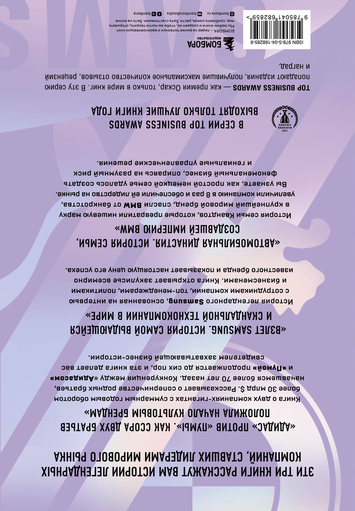 ЭТИ ТРИ КНИГИ РАССКАЖУТ ВАМ ИСТОРИИ ЛЕГЕНДАРНЫХ КОМПАНИЙ, СТАВШИХ ЛИДЕРАМИ МИРОВОГО РЫНКА. «"Адидас" против "Пумы". Как ссора двух братьев положила начало культовым брендам» Книга о двух компаниях-гигантах с суммарным годовым оборотом более 30 млрд $. Рассказывает о соперничестве родных братьев, начавшемся более 70 лет назад. Конкуренция между «Адидасом» и «Пумой» продолжается до сих пор, и эта книга делает вас свидетелем захватывающей бизнес-истории. «Взлет Samsung. История самой выдающейся и скандальной технокомпании в мире» История легендарного Samsung, основанная на интервью с сотрудниками компании, топ-менеджерами, политиками и бизнесменами. Книга открывает закулисье всемирно известного бренда и показывает настоящую цену его успеха. «Автомобильная династия. История семьи, создавшей империю BMW» История семьи Квандтов, которые превратили нишевую марку в крупнейший мировой бренд, спасли BMW от банкротства, увеличили компанию в 8 раз и обеспечили ей лидерство на рынке. Вы узнаете, как простой немецкой семье удалось создать феноменальный бизнес, опираясь на разумный риск и гениальные управленческие решения. В серии Top Business Awards выходят только лучшие книги года. Top Business Awards - как премия «Оскар», только в мире книг. В эту серию попадают издания, получившие максимальное количество отзывов, рецензий и наград.| Издательство | ООО "Издательство "Эксмо" |