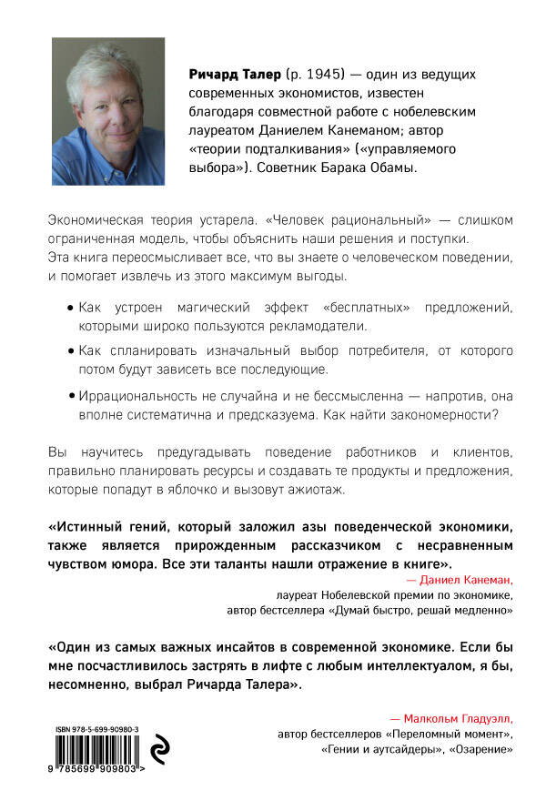 Эти три книги расскажут, что определяет будущее экономики и как устоять в новой непредсказуемой реальности. «Радикальная неопределенность. Манифест о природе экономических кризисов, их прогнозировании и преодолении» - революционный подход к пониманию финансовых катастроф. Автор книги, бывший риск-менеджер Morgan Stanley Ричард Букстейбер, предлагает самый точный способ предвидеть черных лебедей и минимизировать их влияние - учитывать человеческий фактор и множество решений, принимаемых людьми. «Золотой запас. Почему золото, а не биткоины - валюта XXI века?» - актуальное исследование, посвященное золоту и его конкуренту - биткоину, переживающему сейчас очередную зиму. Автор бестселлеров «Валютные войны» и «Смерть денег» Джеймс Рикардс напоминает о преимуществах «золотого якоря» и разоблачает расхожие мифы, связанные с драгоценным металлом. «Новая поведенческая экономика. Почему люди нарушают правила традиционной экономики и как на этом заработать» - ключ к пониманию иррациональных решений и поступков Homo Economicus. Автор книги, лауреат Нобелевской премии по экономике Ричард Талер учит предугадывать нерациональное поведение участников рынков и предсказывать тренды, на которых можно заработать.| Издательство | ООО "Издательство "Эксмо" |