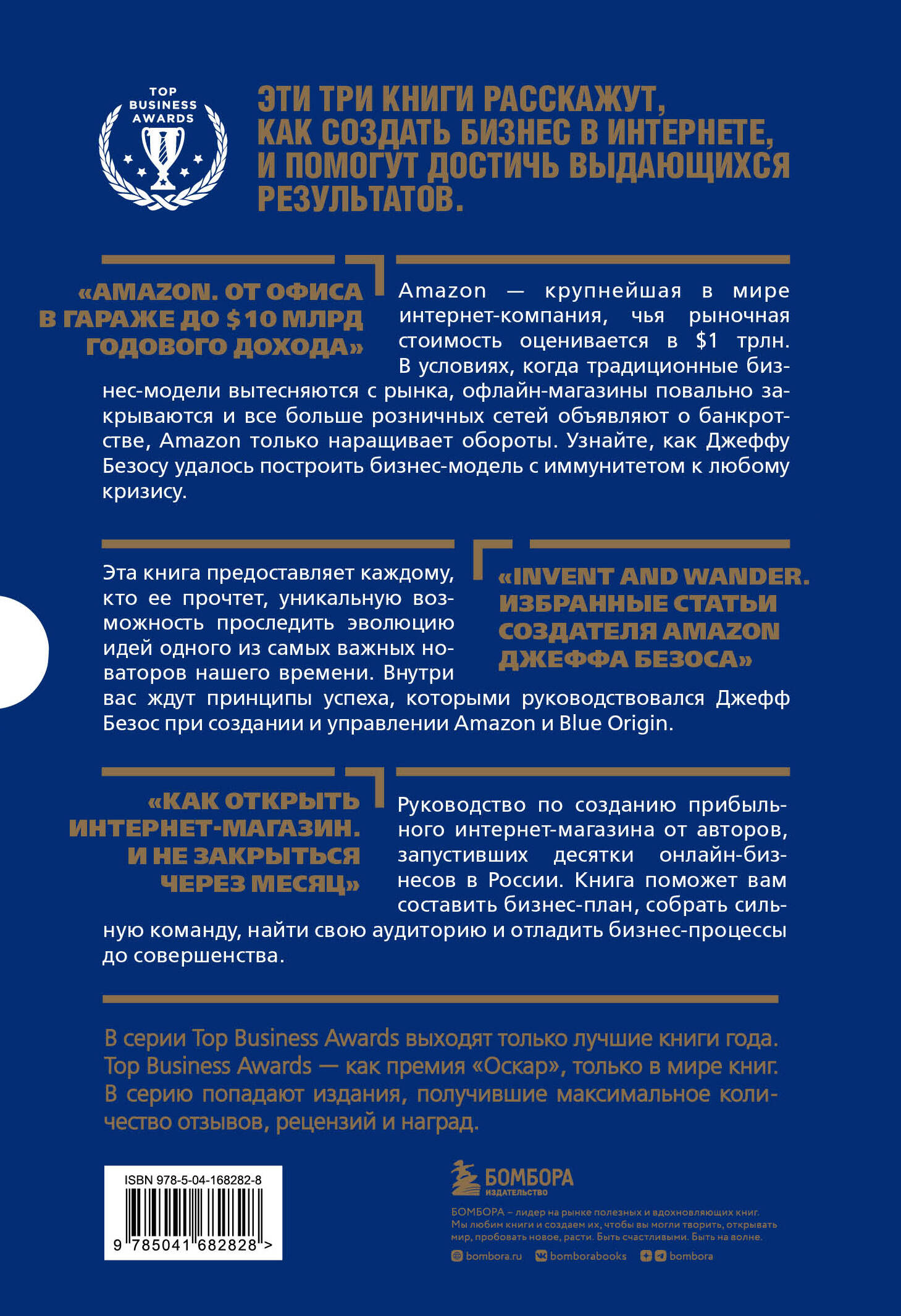 Эти три книги расскажут, как создать бизнес в интернете и помогут достичь выдающихся результатов. «Amazon. От офиса в гараже до $10 млрд годового дохода» Amazon - крупнейшая в мире интернет-компания, чья рыночная стоимость оценивается в $1 трлн. В условиях, когда традиционные бизнес-модели вытесняются с рынка, оффлайн-магазины повально закрываются и все больше розничных сетей объявляют о банкротстве, Amazon только наращивает обороты. Узнайте, как Джеффу Безосу удалось построить бизнес-модель с иммунитетом к любому кризису. «Invent and Wander. Избранные статьи создателя Amazon Джеффа Безоса» Эта книга предоставляет каждому, кто ее прочтет, уникальную возможность проследить эволюцию идей одного из самых важных новаторов нашего времени. Внутри вас ждут принципы успеха, которыми руководствовался Джефф Безос при создании и управлении Amazon и Blue Origin. «Как открыть интернет-магазин. И не закрыться через месяц» Руководство по созданию прибыльного интернет-магазина от авторов, запустивших десятки онлайн-бизнесов в России. Книга поможет вам составить бизнес-план, собрать сильную команду, найти свою аудиторию и отладить бизнес-процессы до совершенства.| Издательство | ООО "Издательство "Эксмо" |