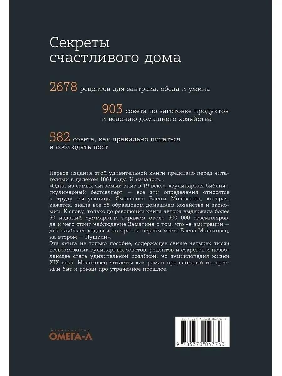 Первое издание этой удивительной книги предстало перед читателями в далеком 1861 году. И началось… «Одна из самых читаемых книг в 19 веке», «кулинарная библия», «кулинарный бестсел лер» - все эти определения относятся к труду выпускницы Смольного Елены Молоховец, которая, кажется, знала все об образцовом домашнем хозяйстве и экономии. К слову, только до революции книга автора выдержала более 30 изданий суммарным тиражом около 500 000 экземпляров, да и чего стоит наблюдение Евгения Замятина о том, что «в эмиграции - два наиболее ходовых автора: на первом месте Елена Молоховец, на втором - Пушкин». Эта книга не только пособие, содержащее свыше четырех тысяч всевозможных кулинарных сове тов, рецептов и секретов и позволяющее стать удивительной хозяйкой, но энциклопедия жизни XIX века. Молоховец читается как роман про сложный интересный быт и роман про утраченное прошлое.| Издательство | Омега-Л |