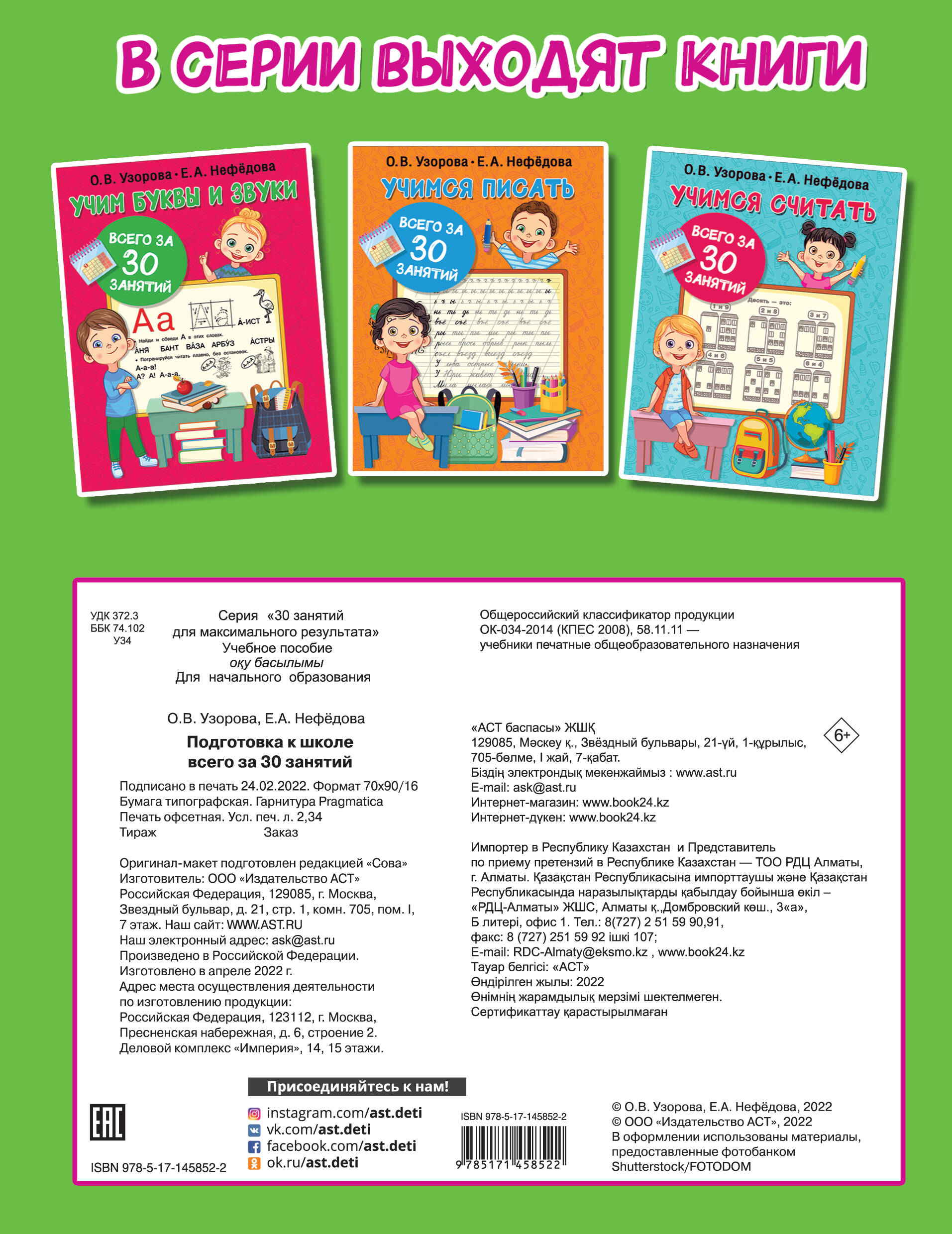1. О. В. Узорова - самый известный и востребованный автор учебных пособий. 2. Эффективная и быстрая методика подготовки детей к обучению в школе. 3. Все важнейшие темы для подготовки к школе. 4. Интересные задания на развитие речи, памяти, внимания, мышления и мелкой моторики| Издательство | АСТ |