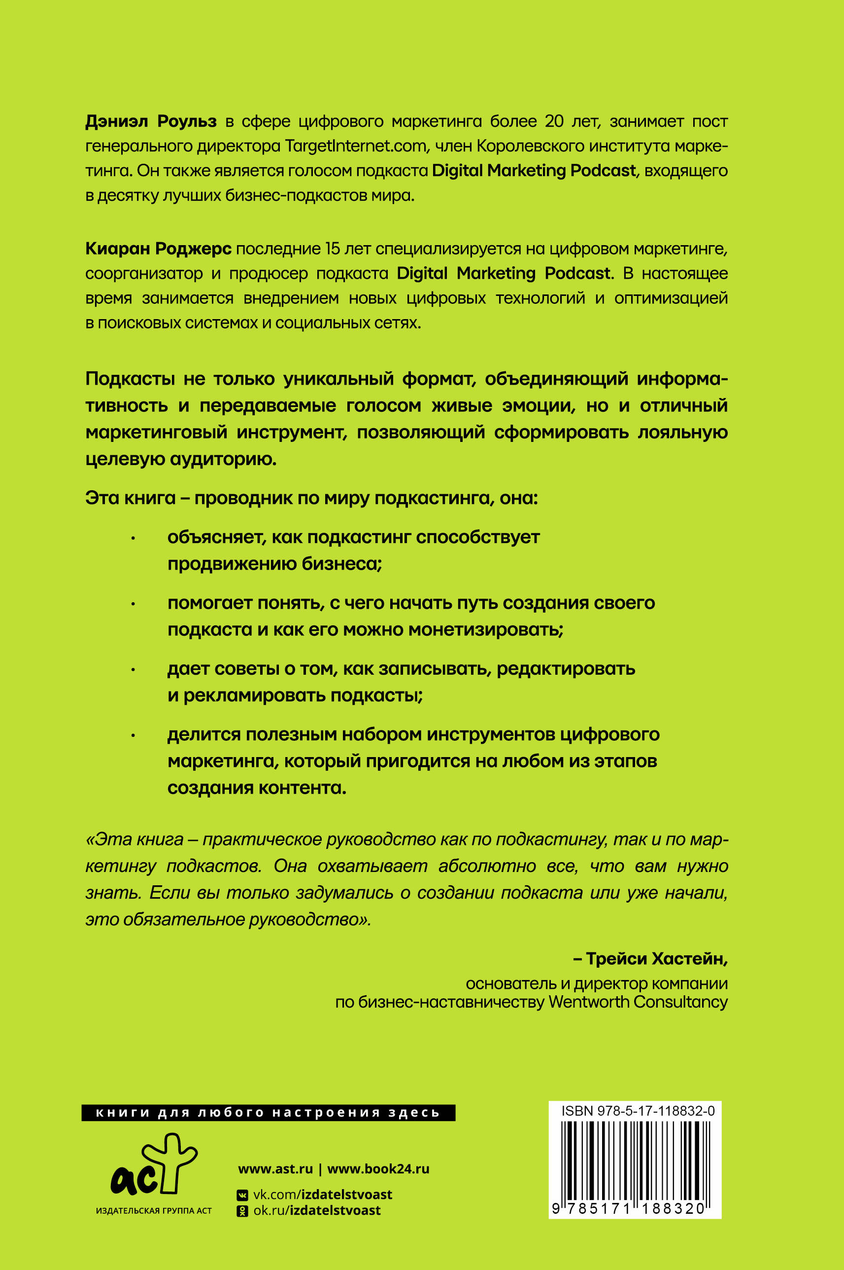 Подкасты не только уникальный формат, объединяющий информативность и передаваемые голосом живые эмоции, но и отличный маркетинговый инструмент, позволяющий сформировать лояльную целевую аудиторию. Эта книга - проводник по миру подкастинга, она объясняет, как подкастинг способствует продвижению бизнеса; помогает понять, с чего начать путь создания своего подкаста и как его можно монетизировать; дает советы о том, как записывать, редактировать и рекламировать подкасты; делится полезным набором инструментов цифрового маркетинга, который пригодится на любом из этапов создания контента.| Издательство | Издательство "АСТ" |