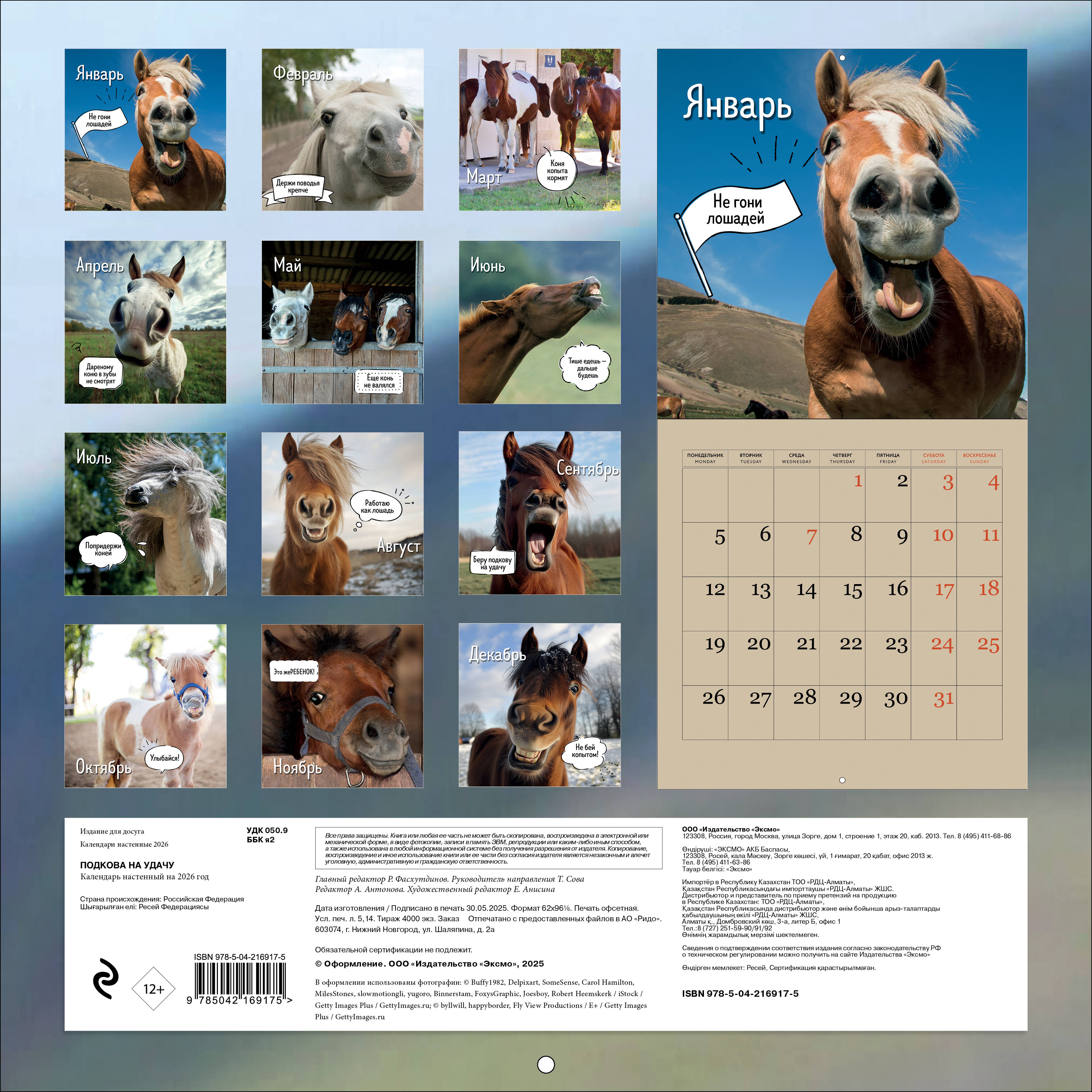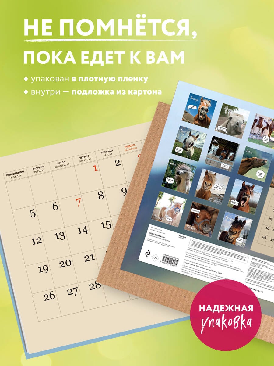 О серии: Наши настенные календари отличаются высоким качеством исполнения! Тщательно подобранные иллюстрации, напечатанные на глянцевой бумаге высочайшего качества, станут настоящим украшением дома, а в календарной сетке найдется место для ваших планов: большие клетки позволят делать записи и организовать свой год! В календаре также отмечены все государственные праздники. В серии настенных календарей издательства «ЭКСМО» каждый найдет тему по вкусу: великие художники, великолепные подборки с самыми знаменитыми произведениями искусства, легендарные кинематографические саги и игры, главные книжные авторы и бестселлеры, фотографии и иллюстрации любимых животных и многое-многое другое! О календаре: Забавный календарь с символом года будет заряжать хорошим настроением каждый месяц. 12 умильных лошадей с яркими фразами придутся по вкусу каждому! Для кого: Большой настенный календарь с уникальными лошадьми и забавными фразами будет радовать вас круглый год. Технические параметры: - Тип календаря - настенный перекидной. - Год - 2026. - Календарная сетка - с разбивкой по месяцам. - Вид скрепления - скрепка. - Внутренний блок - мелованная бумага 115 г/м2. - Подложка - плотный гофрокартон для поддержания формы. - Индивидуальная упаковка в плотный целлофановый пакет.| Издательство | ООО "Издательство "Эксмо" |