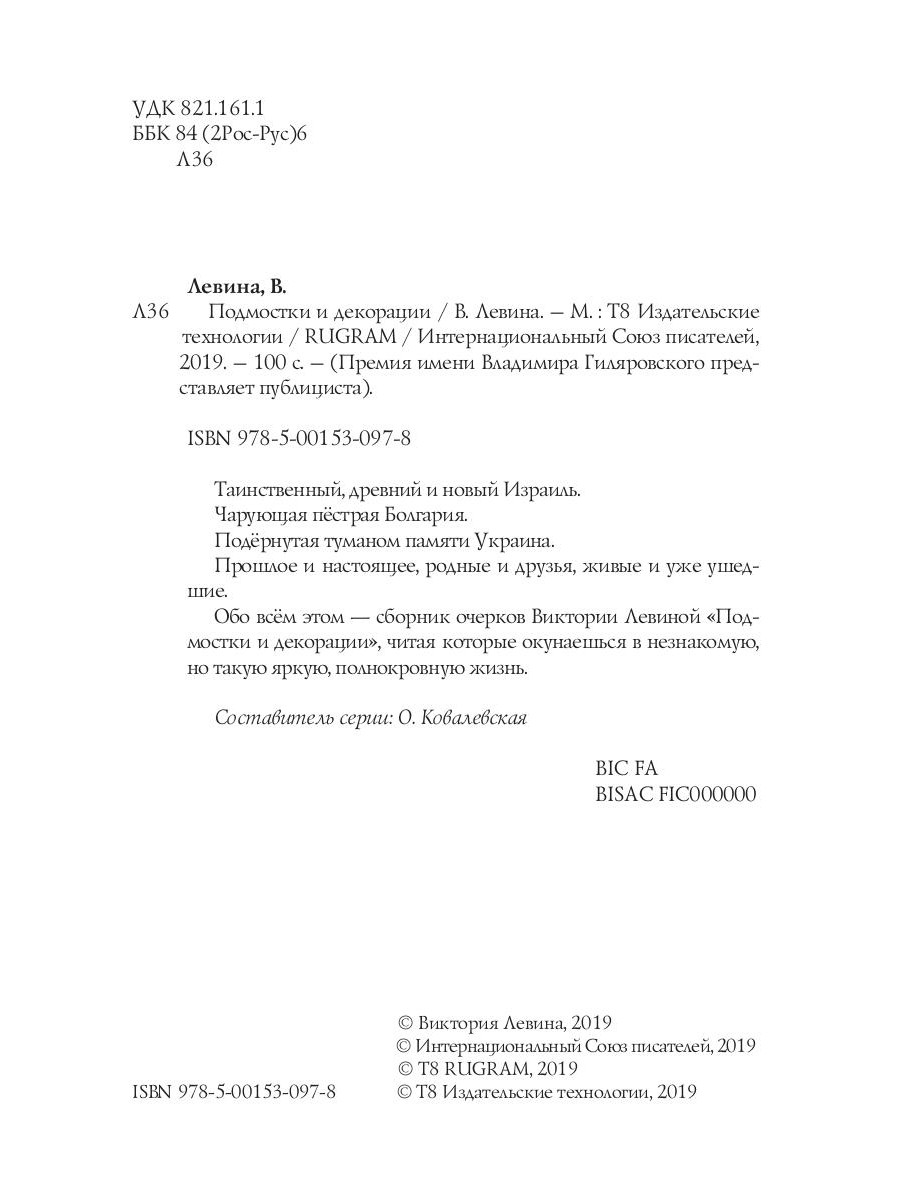 Таинственный, древний и новый Израиль. Чарующая пёстрая Болгария. Подёрнутая туманом памяти Украина Прошлое и настоящее, родные и друзья, живые и уже ушедшие. Обо всём этом - сборник очерков Виктории Левиной «Подмостки и декорации», читая которые окунаешься в незнакомую, но такую яркую, полнокровную жизнь.| Издательство | Т8 RUGRAM |