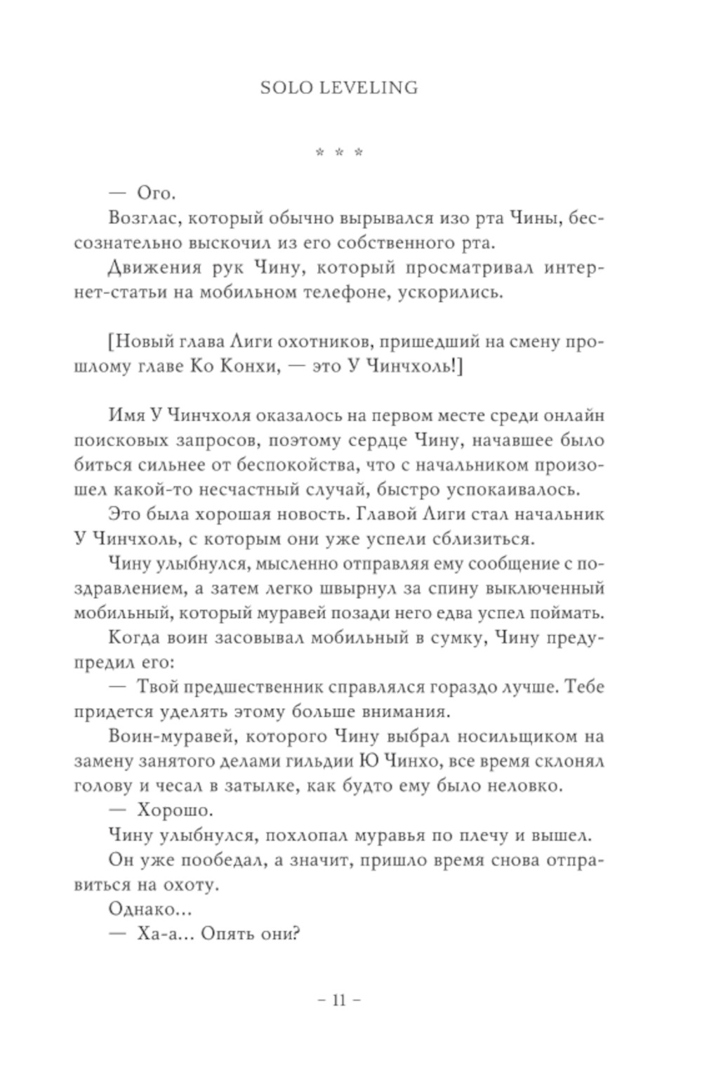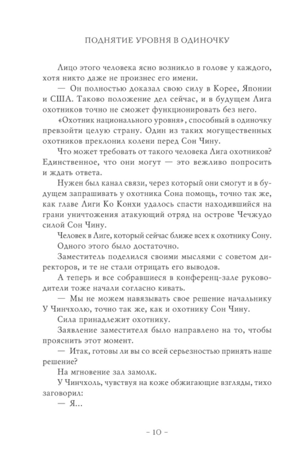 Конец истории человечества или новое начало... Мир потрясен убийством нескольких выдающихся охотников S-ранга. Сон Чину знает, что это лишь вопрос времени, когда монстры нанесут новый удар. Однако объявление страшной войны происходит раньше, чем ожидалось, и принимает вид огромных Врат, нависших в небе над Сеулом. Вместе с Корейской лигой охотников, пытающейся изо всех сил противостоять угрозе, Сон Чину бросает вызов повелителям, не щадящим никого, и собирается попытаться уберечь всех от надвигающейся жуткой катастрофы.| Издательство | АСТ |