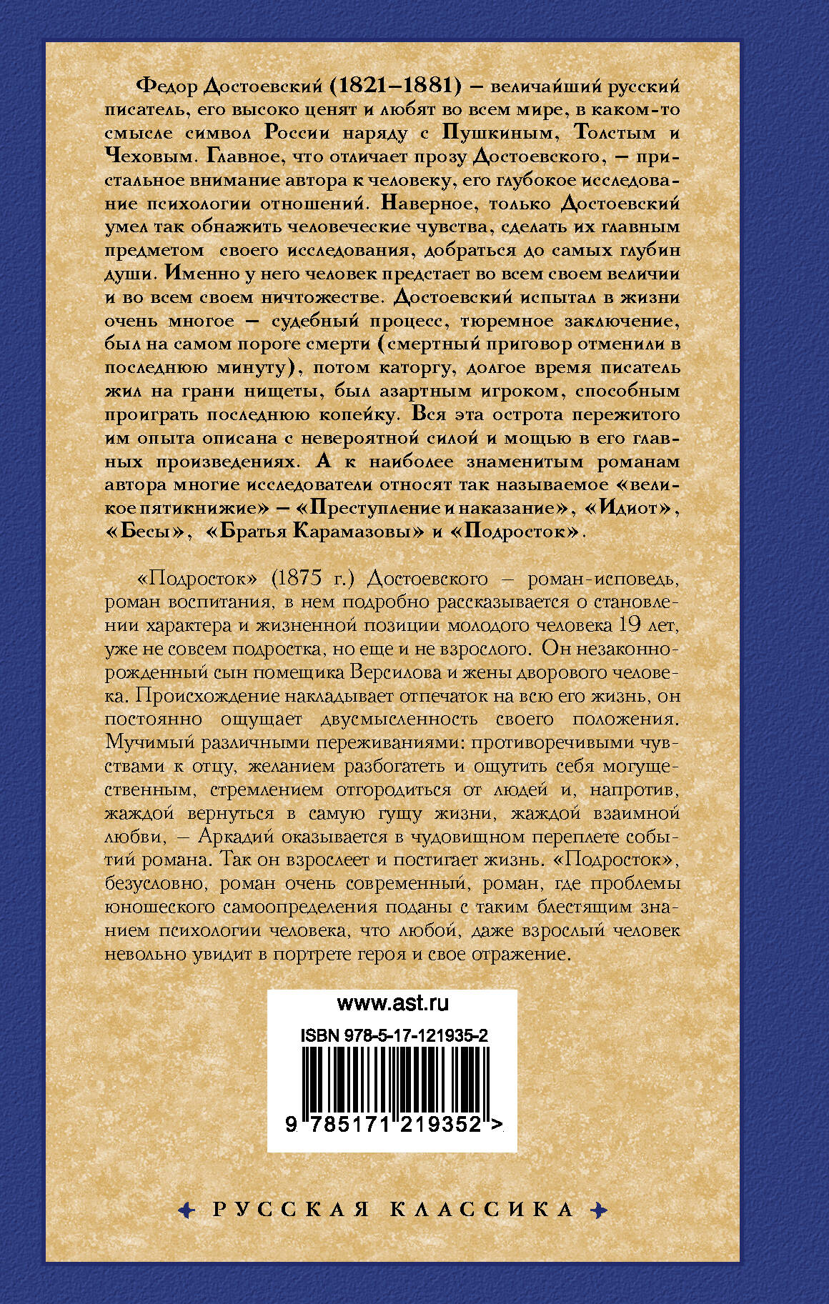 "Подросток". Книга, в которой основная тема творчества великого Достоевского - тема судьбы человека, психологически и духовно не укладывающегося в привычные рамки, - обрамлена запутанным, почти "детективным" сюжетом, достойным классического "романа тайн". Книга не просто гениальная, но еще и бесконечно глубокая. "Отцы и дети" по Достоевскому? Или - интеллектуальный остросюжетный роман? Быть может, то и другое одновременно?..| Издательство | ИЗДАТЕЛЬСТВО "АСТ" |