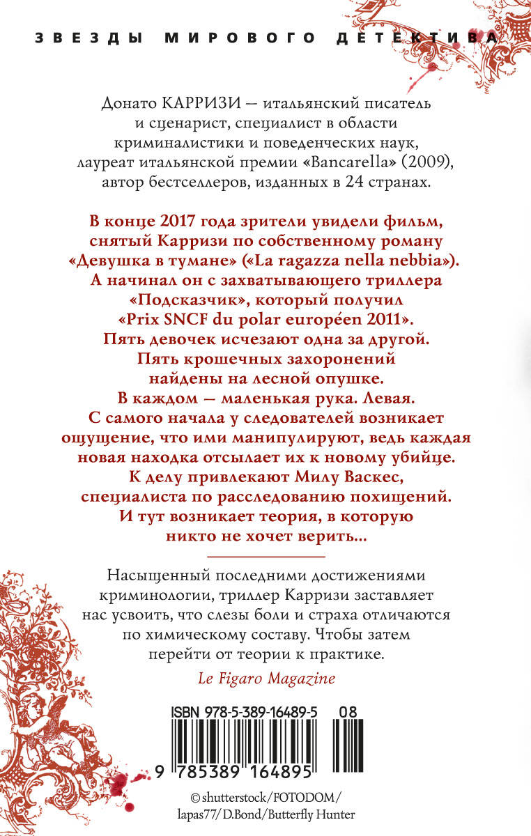 Пять девочек исчезают одна за другой. Пять крошечных захоронений найдены на лесной опушке. В каждом - маленькая рука. Левая. С самого начала расследования у следователей возникает ощущение, что ими манипулируют, ведь каждая новая находка отсылает их к новому убийце. К делу привлекают Милу Васкес, специалиста по похищениям. И тут возникает теория, в которую никто не хочет верить… Захватывающий триллер известного итальянского писателя Донато Карризи "Подсказчик", где за вымыслом стоят реальные факты, публикуется в новом переводе.| Издательство | Азбука-Аттикус Издат.группа ООО |