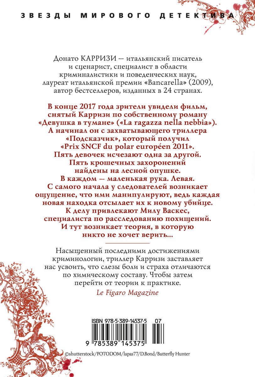 Пять девочек исчезают одна за другой. Пять крошечных захоронений найдены на лесной опушке. В каждом - маленькая рука. Левая. С самого начала расследования у следователей возникает ощущение, что ими манипулируют, ведь каждая новая находка отсылает их к новому убийце. К делу привлекают Милу Васкес, специалиста по похищениям. И тут возникает теория, в которую никто не хочет верить… Захватывающий триллер известного итальянского писателя Донато Карризи "Подсказчик/Бог молчит, дьявол нашептывает", где за вымыслом стоят реальные факты, публикуется в новом переводе.| Издательство | Азбука-Аттикус Издат.группа ООО |