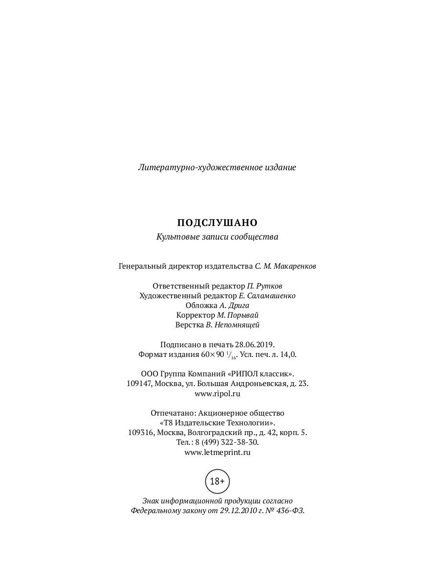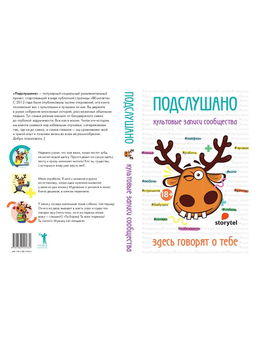 В издании представлены избранные записи «Подслушано» - сообщества «ВКонтакте» с миллионами подписчиков. Это откровенные рассказы обычных людей о самом главном: детстве, семье, любви, работе, о смешных и страшных случаях, домашних любимцах и соседях.| Издательство | Рипол Классик |