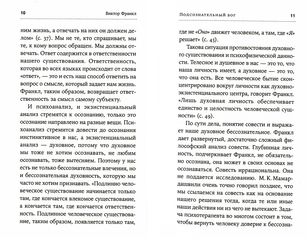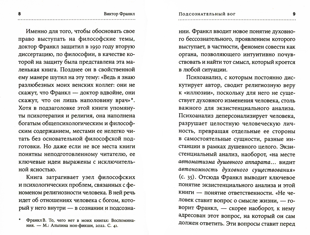 Вниманию читателей предлагается одна из наиболее своеобразных книг выдающегося австрийского психолога Виктора Франкла. Автор рассматривает бессознательное стремление к религиозности как присущее всем людям. При этом необязательно принадлежать к какой-то конфессии и как-то подстраиваться к требованиям конкретной религии. Стремление проявляется в мыслях и действиях человека, а также в сновидениях. Промежуточным шагом к осознанной религиозности выступает феномен совести, которую ученый рассматривает как орган смысла. Здесь впервые Франкл вводит понятие сверхсмысла и рассматривает взаимоотношения человека с этой непостижимой реальностью. «Подсознательный бог» - одна из важнейших работ Виктора Франкла, это необходимое чтение для тех, кто занимается психотерапией профессионально или глубоко интересуется человеческой психологией.| Издательство | Альпина нон-фикшн |
