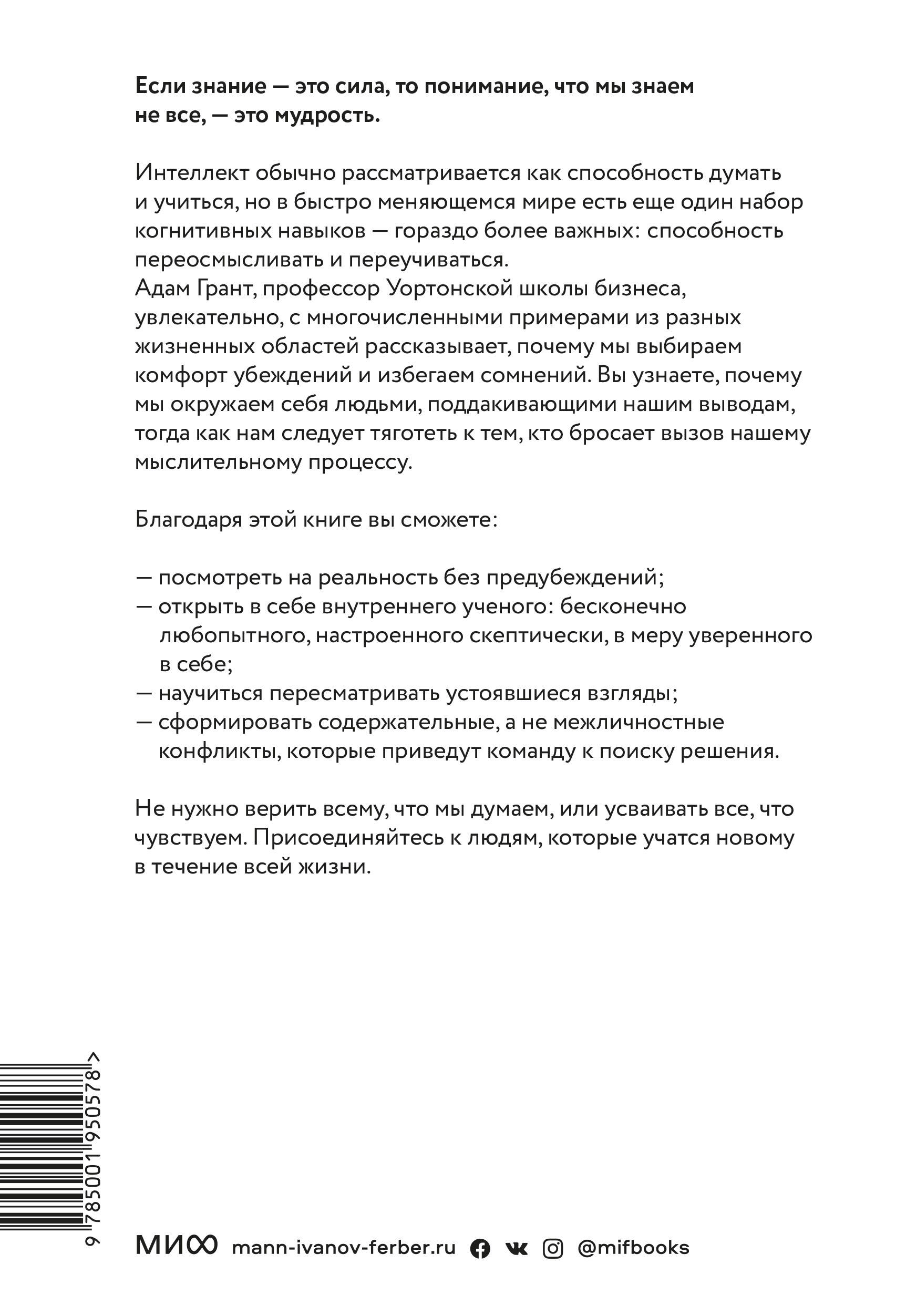 Интеллект обычно рассматривается как способность думать и учиться, но в быстро меняющемся мире есть еще один набор когнитивных навыков, которые могут иметь большее значение: способность переосмысливать и переучиваться. В повседневной жизни слишком многие из нас предпочитают комфорт убеждений неудобству сомнений. Мы прислушиваемся к мнениям, которые заставляют нас чувствовать себя хорошо, а не к идеям, призывающим задуматься. Мы рассматриваем разногласия как угрозу нашему эго, а не как возможность учиться. Мы окружаем себя людьми, которые согласны с нашими выводами, тогда как нам следует тяготеть к тем, кто бросает вызов нашему мыслительному процессу. Если знание - это сила, то знание того, чего мы не знаем, - это мудрость. В этом уверен профессор Адам Грант. Его новая книга поможет: - Освоить навык, который Рэй Далио в своих "Принципах" называет ключевым - умение смотреть на реальность без предубеждений. - Открыть в себе внутреннего Ученого: бесконечно любопытного, настроенного скептически, в меру уверенного в себе. Научиться менять взгляд на вещи. - Формировать содержательные, а не межличностные конфликты, чтобы вести свою команду или группу к поиску решения. - Подталкивать других людей к тому, чтобы они пересматривали устоявшееся видение и мыслили в рамках научного подхода. - Создавать сообщество людей, которые учатся новому в течение всей жизни. Обо всем этом Адам Грант рассказывает увлекательно, с юмором и примерами из самых разных сфер, с блестяще подобранными иллюстрациями и графиками, которые способствуют легкости чтения. Книга Адама Гранта показывает, что нам не нужно верить всему, что мы думаем, или усваивать все, что чувствуем. Это приглашение отказаться от взглядов, которые больше не служат нам, и ценить умственную гибкость выше глупой последовательности. Фишки книги: - Рекомендуют Билл Гейтс и Даниэль Канеман. - Бестселлер Амазон - 6 недель в топ-10 среди всего нон-фикшн. - Более 1000 оценок на Amazon и 3,5 тыс. оценок на Goodreads за 1 месяц. - Книга переведена на 41 язык. - В США и Канаде продано более полумиллиона экземпляров. Для кого книга: Для всех, кто хочет научиться критически оценивать реальность и свои решения, переосмысливать и переучиваться, двигаясь вперед.| Издательство | Манн, Иванов и Фербер |