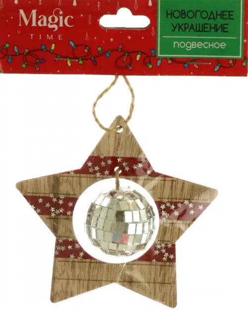 Новогоднее подвесное украшение в виде звездочки с диско-шаром прекрасно дополнит собой праздничный интерьер или новогоднюю елку и просто будет радовать окружающих. Своим универсальным дизайном украшение локанично подчеркнет убранство дома, подарит ощущение сказки и волшебства. Изделие выполнено из древесины.