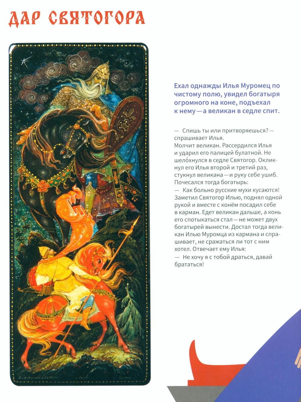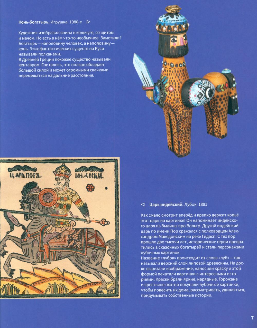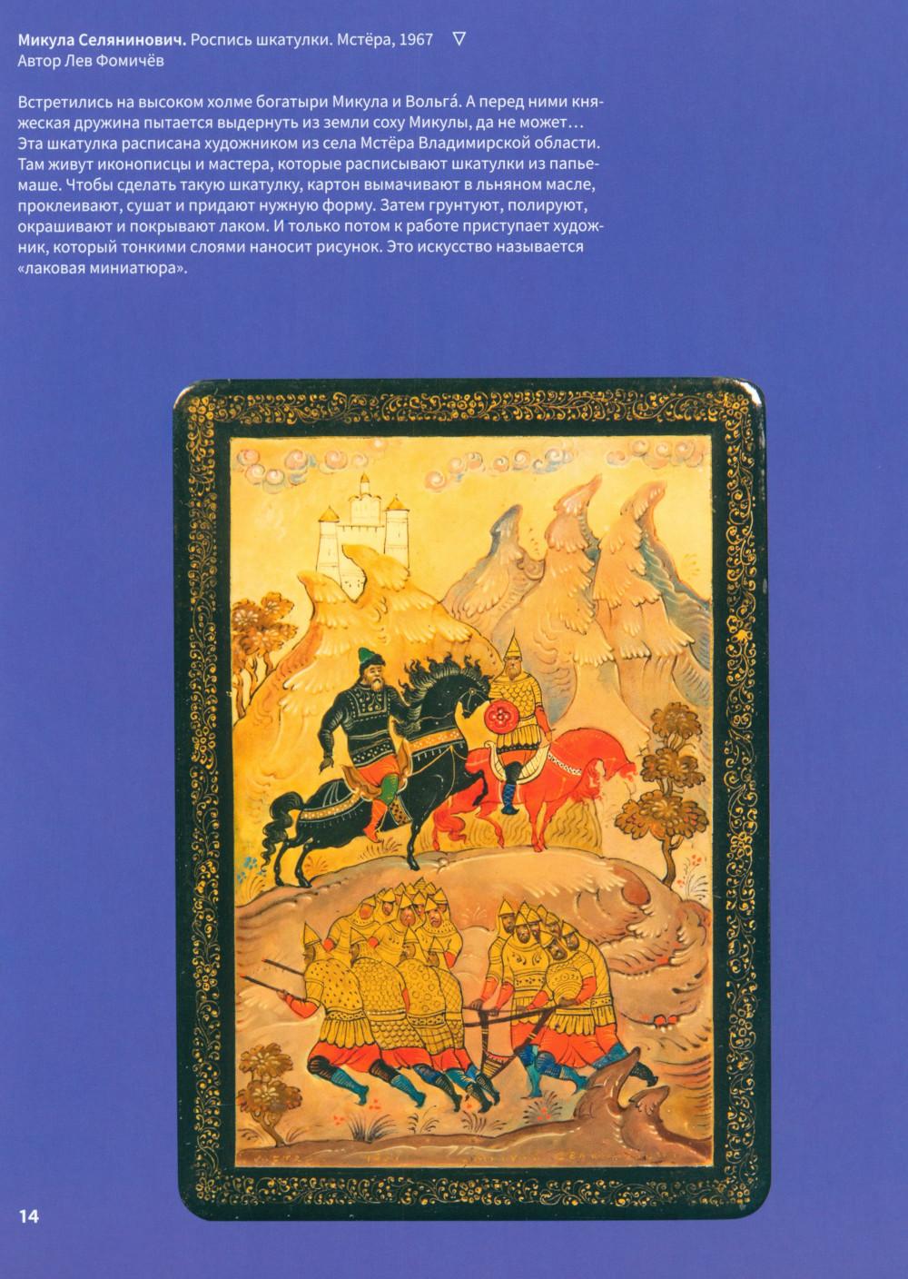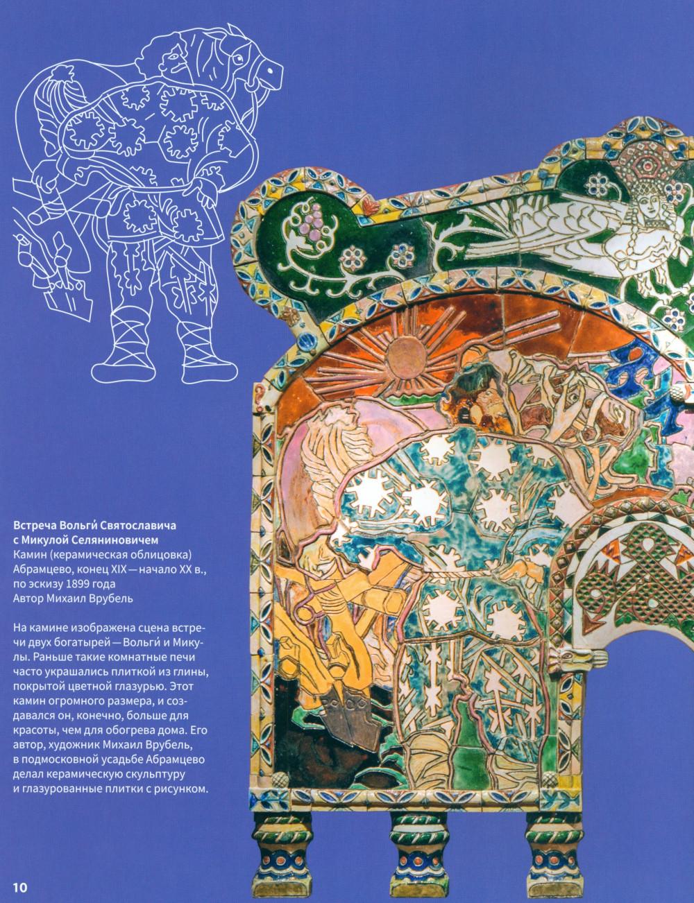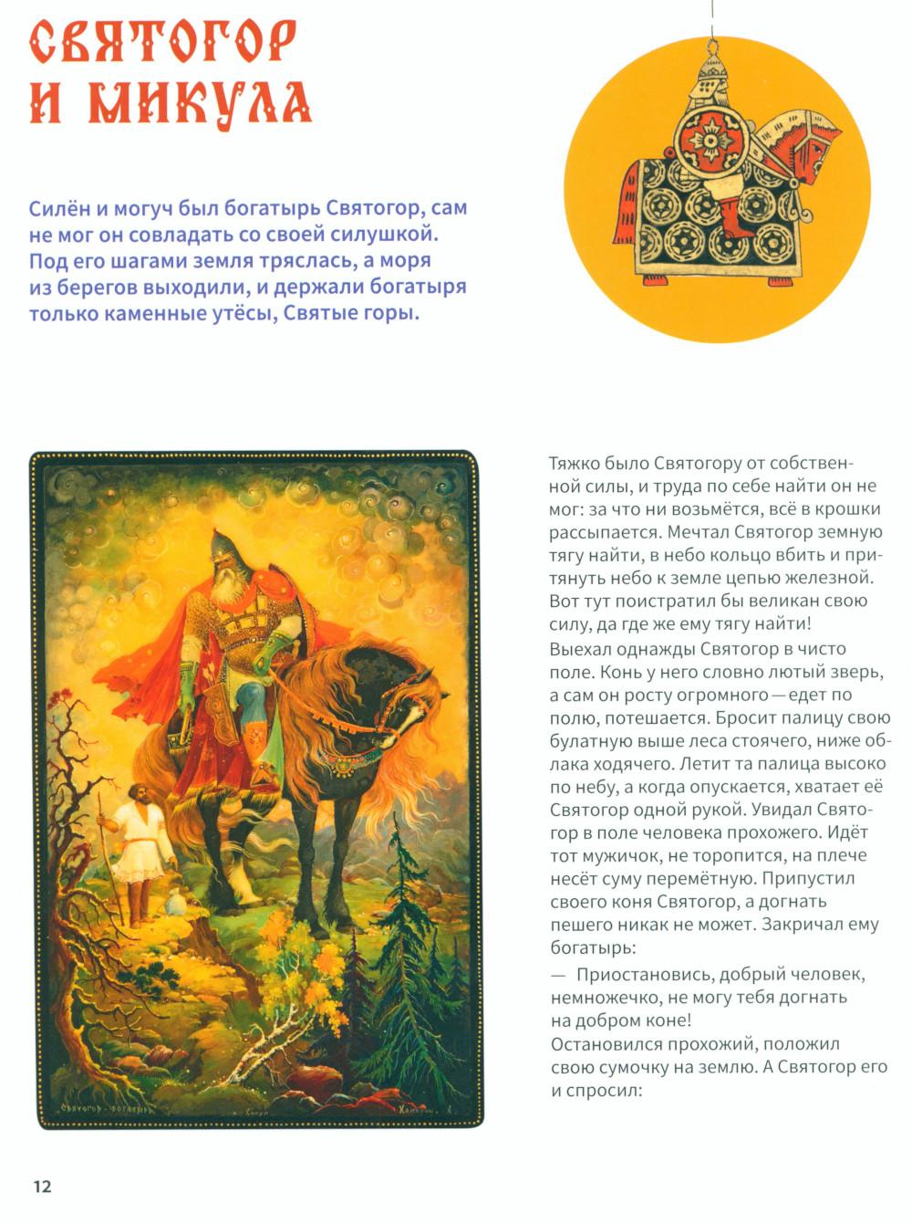 Эта книга про Древнюю Русь и старинные времена, когда народом русским правили князья, а по полям разъезжали богатыри, которые защищали Русскую землю от врагов и страшных змеев. Самые древние герои былин -Вольга, Святогор и Микула -были мифическими богатырями, они могли управлять стихиями природы и превращаться в волшебных зверей. Много славных подвигов совершили богатыри Илья, Добрыня и Алёша. Имена этих молодцев встречаются в летописях, легендах и исторических песнях. Они служили князю Владимиру по прозванию Красно Солнышко, который крестил Русь. Были на Руси и женщины-богатырши-Василиса и Настасья. Защитили и прославили родную землю также князья-полководцы. Александр Невский победил огромное войско на Ледовом побоище у Новгорода, а князь московский Дмитрий Донской одолел врага на Куликовом поле. Русские богатыри -сильные и смелые, находчивые и смекалистые -вдохновляли не только сказителей былин. Писатели сочиняли о них повести и сказки, композиторы писали оперы, художники изображали их на картинах и в скульптурах. Всех героев, и сказочных, и реальных, можно найти на этих страницах. Для тебя их нарисовал художник книги. В Музее декоративного искусства богатыри изображены на предметах из дерева, металла, глины, стекла и тканей. На выставках в музее ты найдёшь всё, что тебе понравится в книге: на чашках, кубках, шкатулках, в фарфоровых и глиняных статуэтках, свистульках и деревянных игрушках.| Издательство | Изд.Арт-Волхонка |