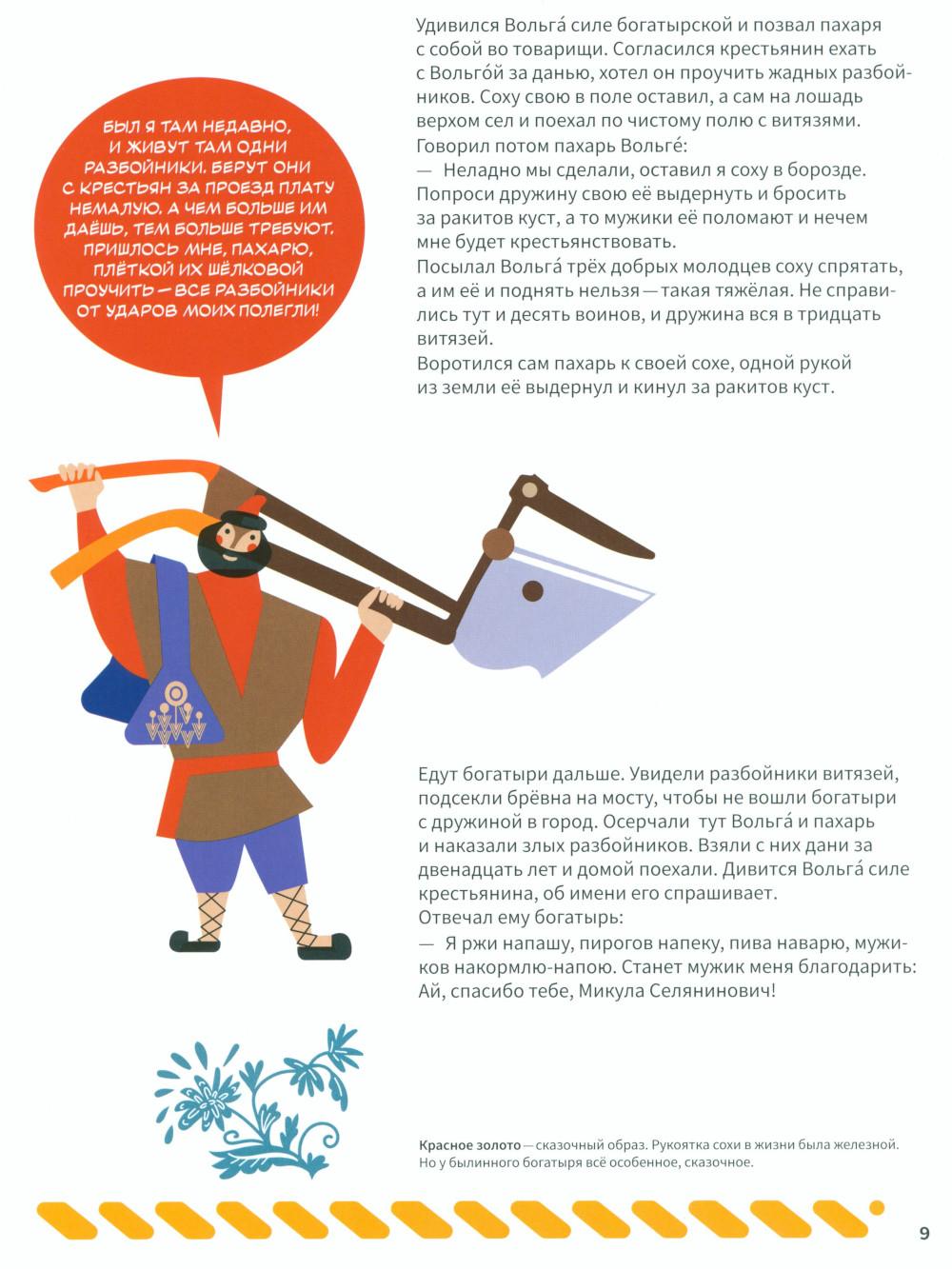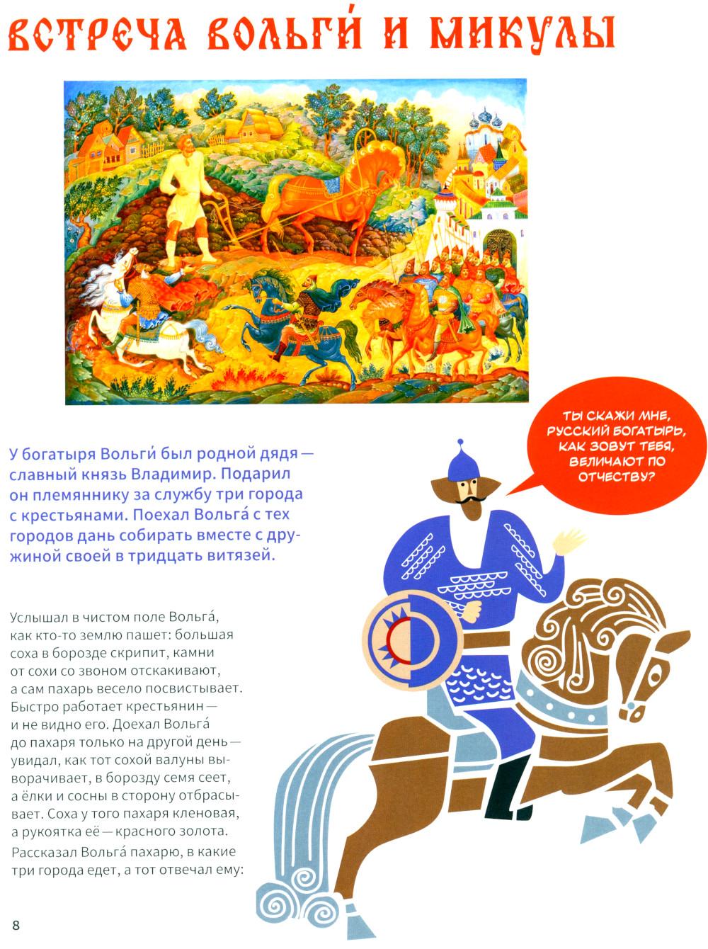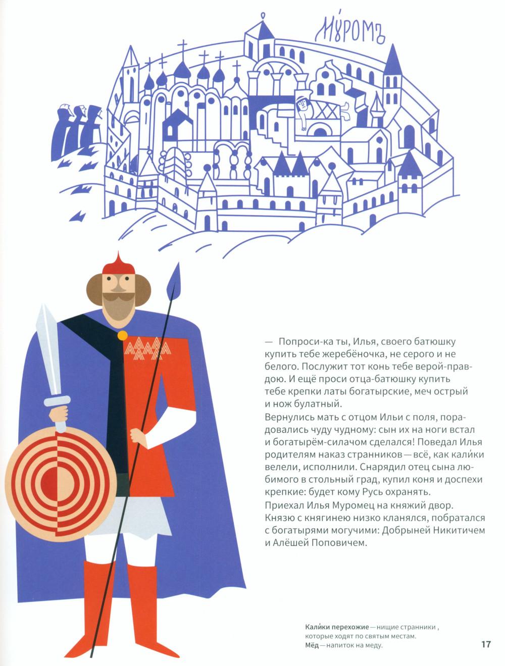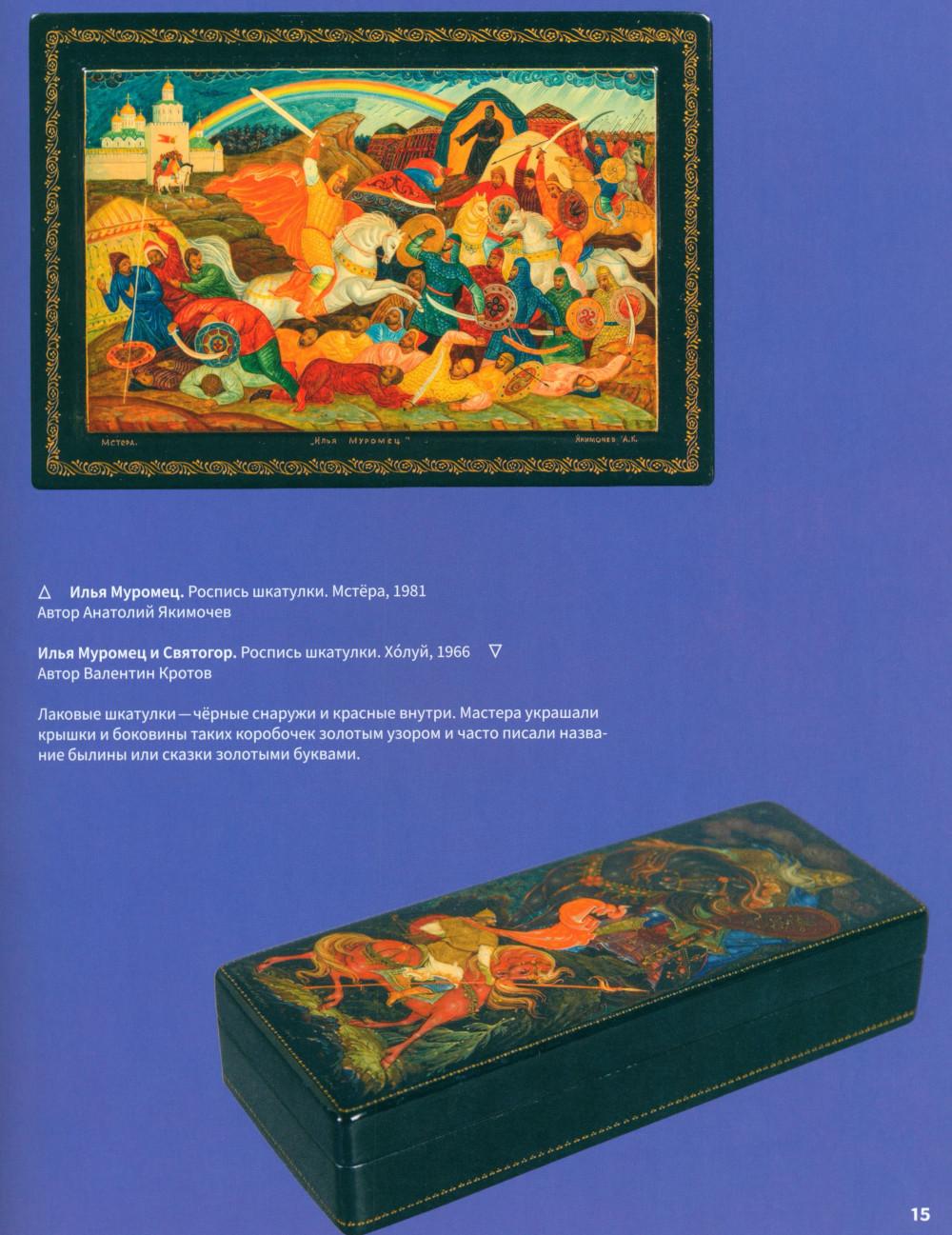 Эта книга про Древнюю Русь и старинные времена, когда народом русским правили князья, а по полям разъезжали богатыри, которые защищали Русскую землю от врагов и страшных змеев. Самые древние герои былин -Вольга, Святогор и Микула -были мифическими богатырями, они могли управлять стихиями природы и превращаться в волшебных зверей. Много славных подвигов совершили богатыри Илья, Добрыня и Алёша. Имена этих молодцев встречаются в летописях, легендах и исторических песнях. Они служили князю Владимиру по прозванию Красно Солнышко, который крестил Русь. Были на Руси и женщины-богатырши-Василиса и Настасья. Защитили и прославили родную землю также князья-полководцы. Александр Невский победил огромное войско на Ледовом побоище у Новгорода, а князь московский Дмитрий Донской одолел врага на Куликовом поле. Русские богатыри -сильные и смелые, находчивые и смекалистые -вдохновляли не только сказителей былин. Писатели сочиняли о них повести и сказки, композиторы писали оперы, художники изображали их на картинах и в скульптурах. Всех героев, и сказочных, и реальных, можно найти на этих страницах. Для тебя их нарисовал художник книги. В Музее декоративного искусства богатыри изображены на предметах из дерева, металла, глины, стекла и тканей. На выставках в музее ты найдёшь всё, что тебе понравится в книге: на чашках, кубках, шкатулках, в фарфоровых и глиняных статуэтках, свистульках и деревянных игрушках.| Издательство | Изд.Арт-Волхонка |