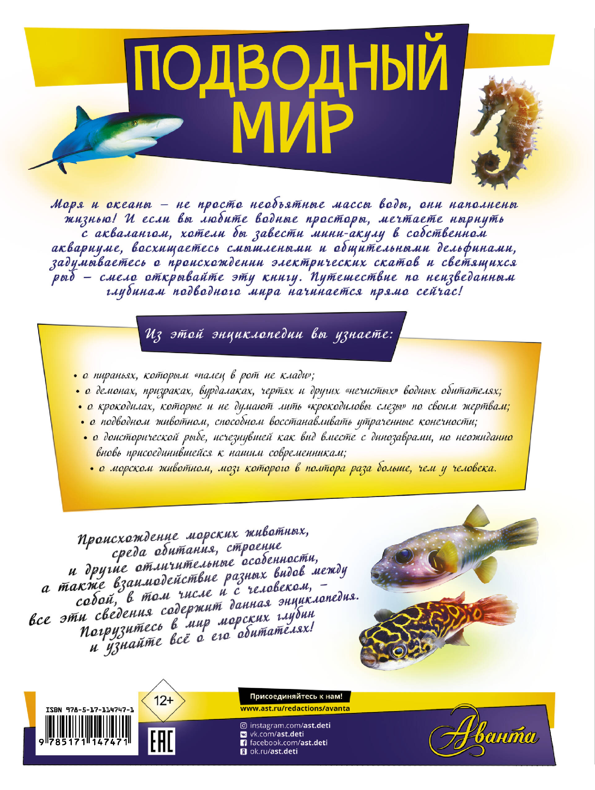 Эта большая энциклопедия открывает юным читателям тайны подводного мира и его обитателей. Здесь рассказывается о жителях глубин и отмелей, береговой линии суши и надводных скал, соленых и пресных вод - представителях всех широт и концов света! Некоторых животных, с которыми знакомит книга, невозможно встретить в повседневной жизни, даже в зоопарке или океанариуме. Тем интереснее будет узнать, какие жители морей самые "разговорчивые", что за "электрики" водятся в океане, где живет прабабушка современных рыб, какое подводное существо, как и кенгуру, носит сумку для детей, какую рыбу назвали "в честь" птицы, а какой дали целых три имени и многое, многое другое! Прекрасно иллюстрированное издание с множеством важных, интересных и просто невероятных фактов не оставит равнодушными ни детей, ни их родителей. Для среднего и старшего школьного возраста.| Издательство | Издательство "АСТ" |