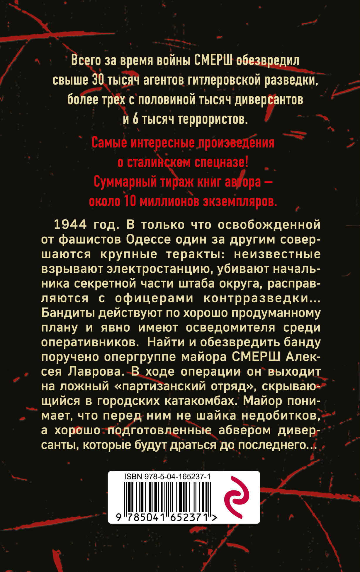Самые интересные произведения о сталинском спецназе! Общий тираж книг А. Тамоникова - около 10 миллионов экземпляров! 1944 год. В только что освобожденной от фашистов Одессе один за другим совершаются крупные теракты: неизвестные взрывают электростанцию, убивают начальника секретной части штаба округа, расправляются с офицерами контрразведки… Бандиты действуют по хорошо продуманному плану и явно имеют осведомителя среди оперативников. Найти и обезвредить банду поручено опергруппе майора СМЕРШа Алексея Лаврова. В ходе операции он выходит на ложный «партизанский отряд», скрывающийся в городских катакомбах. Майор понимает, что перед ним не шайка недобитков, а хорошо подготовленные абвером диверсанты, которые будут драться до последнего…| Издательство | Эксмо |