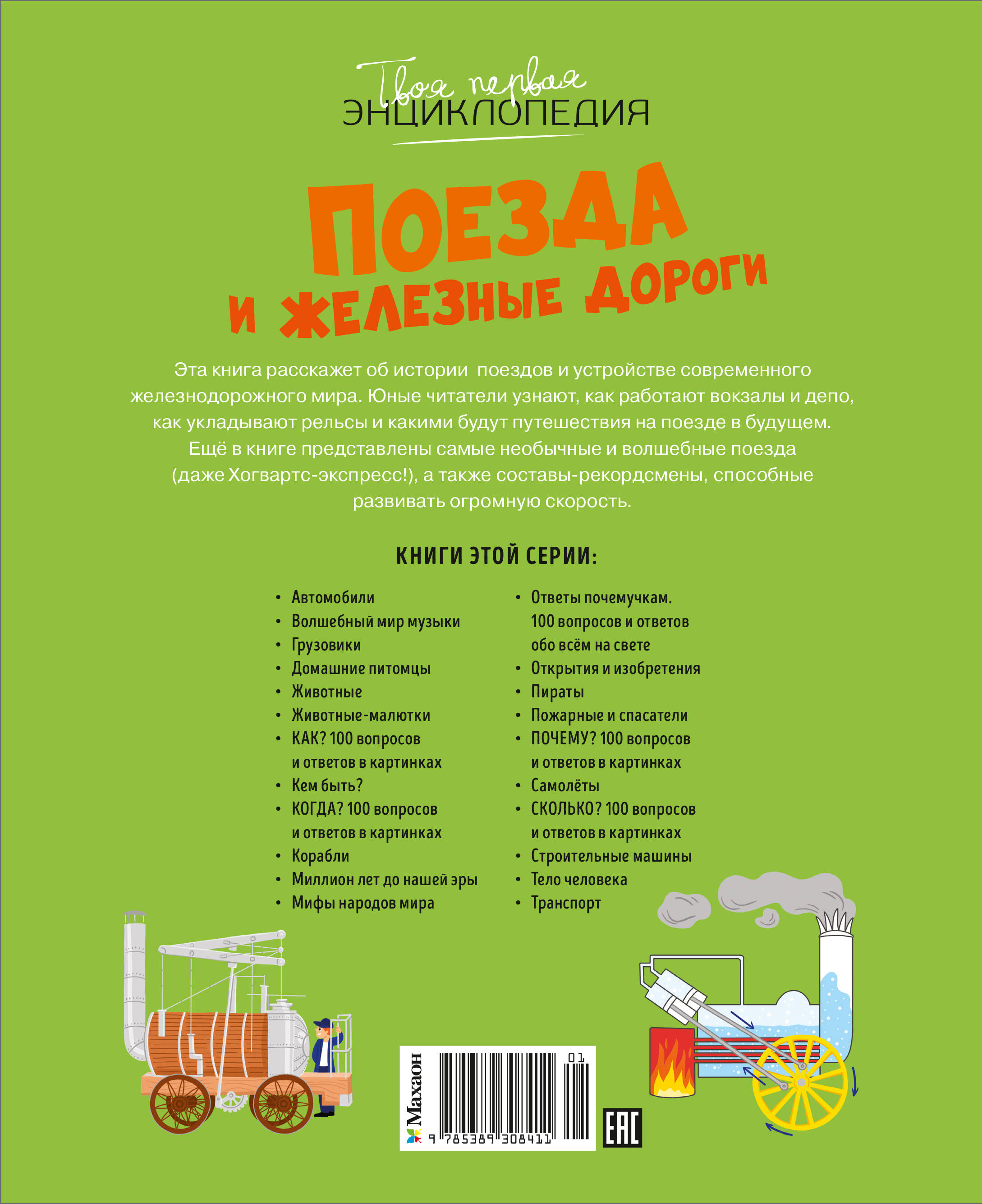 Эта энциклопедия для детей - идеальный подарок для любителей поездов! Все, что ты хотел знать о поездах и железных дорогах, собрано в одной книге! Что тебя ждет внутри: • Потрясающие иллюстрации и фотографии: поезда во всем их разнообразии! • Увлекательные истории и факты: как появились первые поезда, как устроены железные дороги, какие новые высокоскоростные составы ездят в разных странах и многое другое! • Интерактивные задания: проверь свои знания и закрепи полученную информацию в игровой форме! • Высококачественная печать, плотная бумага и стильный дизайн сделают чтение не только полезным, но и приятным.| Издательство | Издательство АЗБУКА ООО |