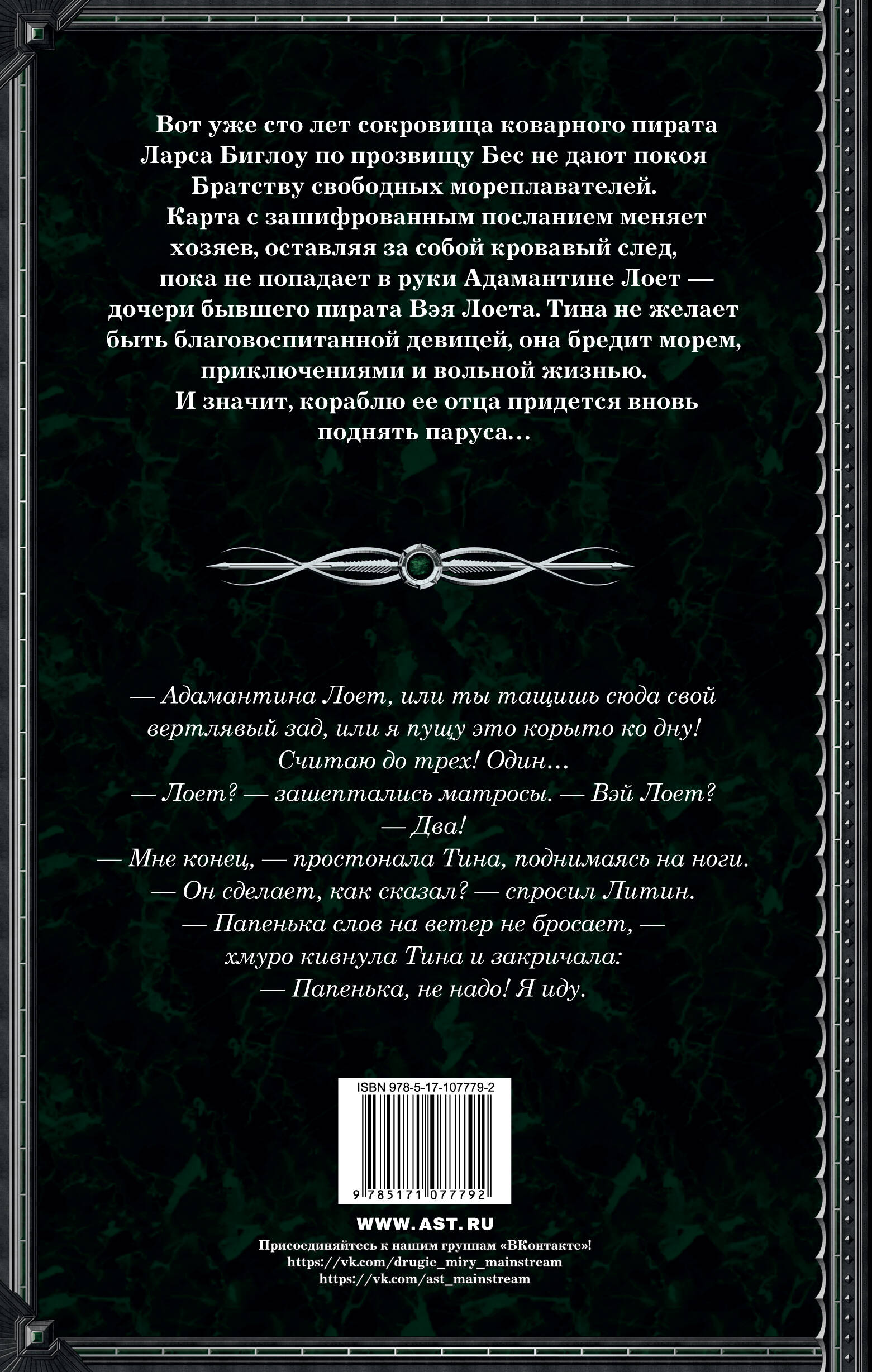 Вот уже сто лет сокровища коварного пирата Ларса Биглоу по прозвищу Бес не дают покоя Братству свободных мореплавателей. Карта с зашифрованным посланием меняет хозяев, оставляя за собой кровавый след, пока не попадает в руки Адамантине Лоет - дочери бывшего пирата Вэя Лоета. Тина не желает быть благовоспитанной девицей, она бредит морем, приключениями и вольной жизнью. И значит, кораблю ее отца придется вновь поднять паруса…| Издательство | ИЗДАТЕЛЬСТВО "АСТ" |
