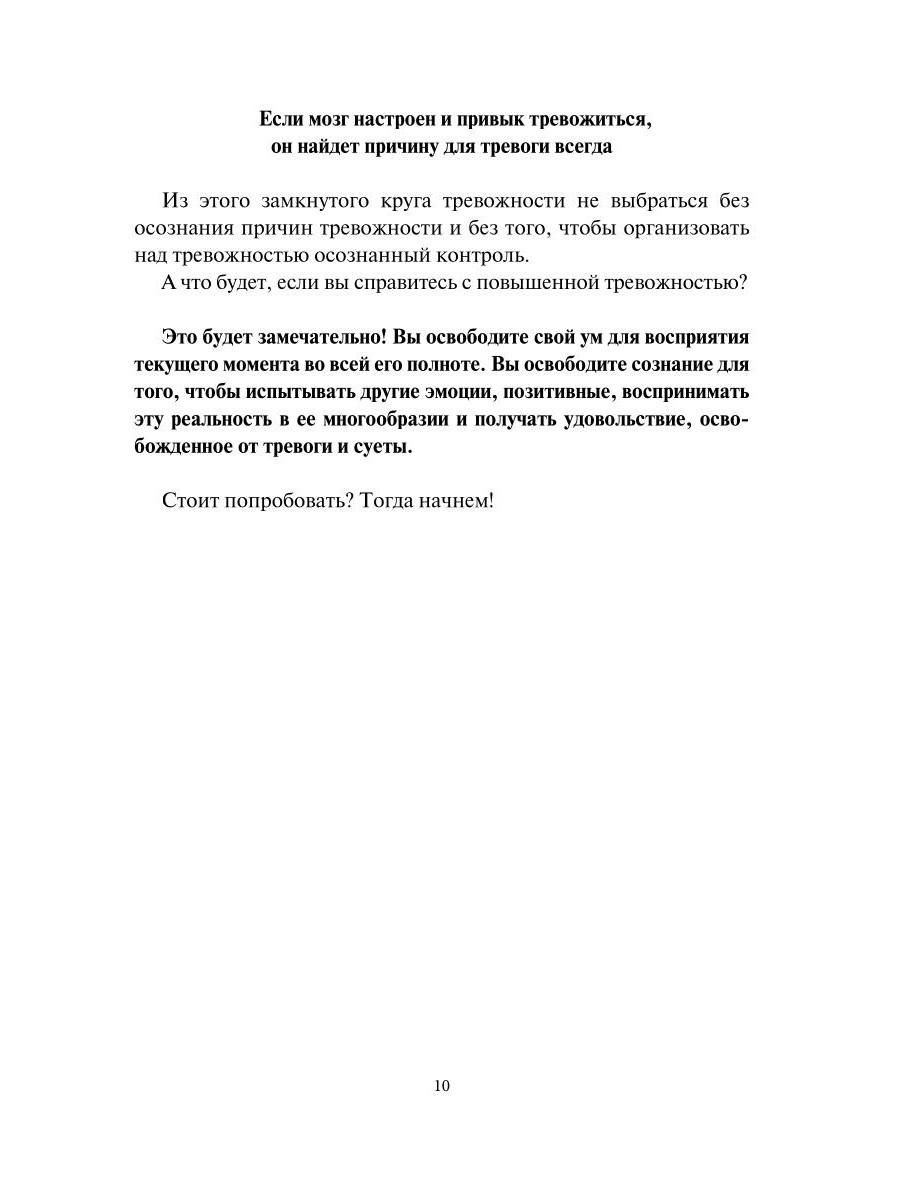 Если вы постоянно чувствуете тревожность; вас преследуют навязчивые мысли; мучают перепады настроения или даже панические атаки; вы "накручиваете" себя или поддаетесь неконтролируемой злости и агрессии; вы забыли, когда спокойно могли расслабиться и жить счастливо, - тогда эта книга для вас! С ее помощью вы научитесь: - контролировать тревожность; - управлять своими эмоциями (гневом, злостью, завистью); - повышать свою самооценку и держать ее на постоянном уровне; - стать счастливыми и радоваться моменту "здесь и сейчас"! В книге вас ждет не только теория, но и практика по управлению собственными мыслями и настроением. Доступные и простые упражнения научат вас контролировать свое мышление и успокоить сознание, достигнув гармонии.| Издательство | Рипол Классик |
