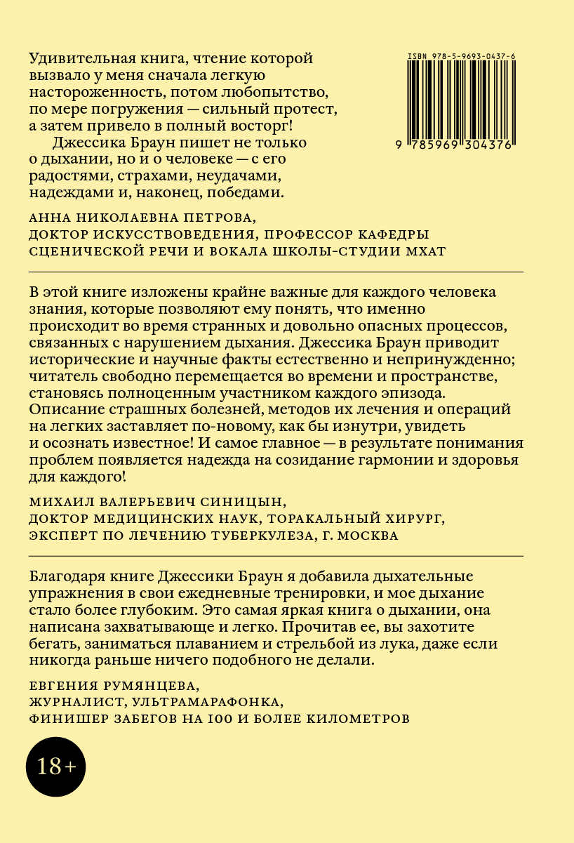 Без дыхания жизнь невозможна: с первым вдохом человек приходит в этот мир, с последним выдохом его покидает. Исследуя феномен дыхания, автор книги Джессика Браун занимается дыхательной гимнастикой вместе с будущими матерями, проводит ночь в лаборатории сна, посещает людей, страдающих хроническим заболеванием легких, медитирует с индийским гуру и ныряет с фридайвером. Она подробно описывает и объясняет всё, что происходит с нашим организмом, когда мы дышим. Это позволяет нам увидеть, как соединены в человеке сознание и тело, а также понять, что, овладев искусством дыхания, можно изменить свою жизнь. В издании приводятся специальные упражнения для улучшения дыхательного процесса, для укрепления голоса, для концентрации сознания, для успокоения и здорового сна. Книга весьма познавательна; она предназначена всем, кого интересует, как и чем дышит человек. Она важна и для тех, кто не испытывает проблем с дыханием, и для тех, кому каждый вдох дается с трудом.| Издательство | Олимп-Бизнес |