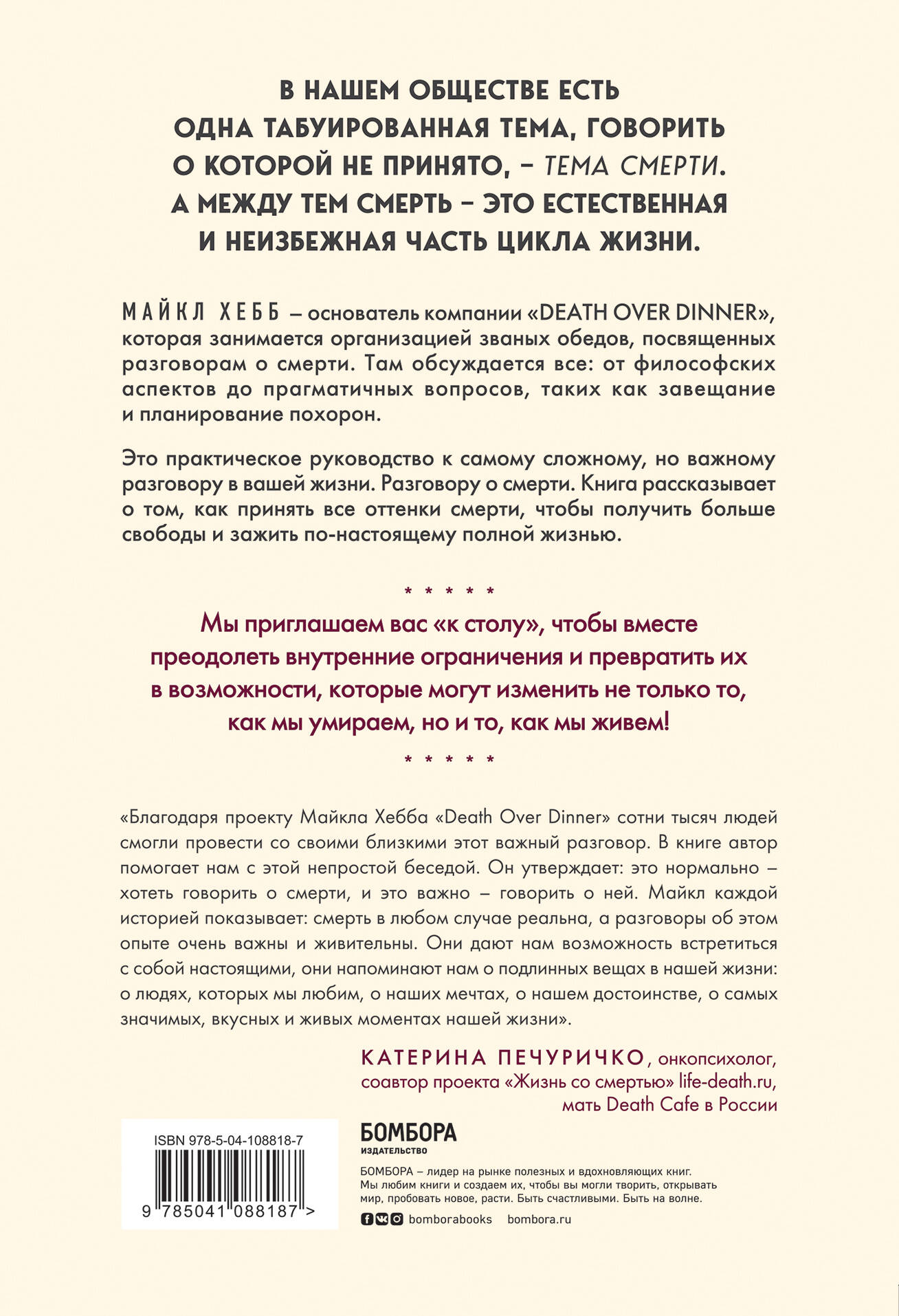 В нашем обществе есть одна табуированная тема, говорить о которой не принято, - тема смерти. А между тем это естественная и неизбежная часть цикла жизни. Майкл Хебб - основатель компании "Death Over Dinner", которая занимается организацией званых обедов, посвященных разговорам о смерти. Там обсуждается все: от философских аспектов до практических вопросов, таких как завещания и планирование похорон. Это практическое руководство к самому сложному, но важному разговору в вашей жизни. Разговору о смерти. Книга рассказывает о том, как принять все оттенки смерти, чтобы получить больше свободы и зажить по-настоящему полной жизнью. Мы приглашаем вас "к столу", чтобы вместе преодолеть внутренние ограничения и превратить их в возможности, которые могут изменить не только то, как мы умираем, но и то, как мы живем!| Издательство | ООО "Издательство "Эксмо" |