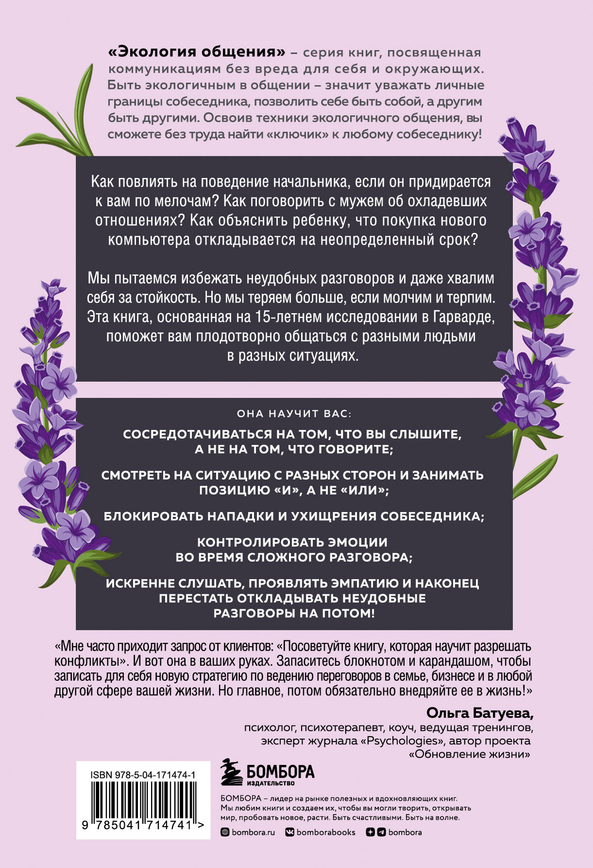 ОТ ИЗДАТЕЛЯ Как повлиять на поведение начальника, если он придирается к вам по мелочам? Как поговорить с мужем об охладевших отношениях? Как объяснить ребенку, что покупка нового компьютера откладывается на неопределенный срок? Мы пытаемся избежать неудобных разговоров и даже хвалим себя за стойкость. Но мы теряем больше, если молчим и терпим. Эта книга, основанная на 15-летнем исследовании в Гарварде, поможет вам плодотворно общаться с разными людьми в разных ситуациях. Она научит вас: ● сосредотачиваться на том, что вы слышите, а не на том, что говорите; ● смотреть на ситуацию с разных сторон и занимать позицию «и», а не «или»; ● блокировать нападки и ухищрения собеседника; ● контролировать эмоции во время сложного разговора; ● искренне слушать, проявлять эмпатию и наконец перестать откладывать разговоры на потом! ОБ АВТОРАХ Дуглас Стоун, Брюс Паттон и Шейла Хин преподают в Гарвардской школе права и Гарвардском переговорном проекте. Они были консультантами бизнесменов, правительств, организаций, сообществ и отдельных лиц по всему миру, а также писали о переговорах и общении в различных изданиях, от New York Times до журнала Parents. Стоун и Хин являются авторами книги «Спасибо за обратную связь». Книга также выходит под названием «Неудобные разговоры. Как общаться на невыносимо трудные темы». ОТЗЫВЫ «Невероятно ясные примеры и точные советы, каких мы никогда не видели раньше». - Dallas Morning News «Единственные люди, которым не нужно читать "Неудобные разговоры", - это те, кто никогда и ни при каких обстоятельствах не работает с другими людьми». - Питер М. Сенге, автор бестселлера «Пятая дисциплина» «О применении эмоционального интеллекта в самые трудные моменты жизни». - Дэниел Гоулман, автор бестселлера «Эмоциональный интеллект на работе» ЦИТАТЫ • Чем больше вы избавляете человека от необходимости защищаться, тем легче ему становится воспринимать ваши слова и размышлять о сложности своей мотивации. • Одна из распространенных ошибок мышления заключается в том, чтобы целиком возложить вину на одну из сторон - либо на себя, либо (что случается еще чаще) на другого. • Когда вы начинаете заботиться о чужих чувствах в ущерб своим, вы учите окружающих игнорировать ваши чувства. • Вера в существование четких временных рамок для того, чтобы что-то пережить - это всего лишь очередной способ загнать себя в угол. • Простой совет о том, как обращаться с просьбами, звучит так: не делайте из нее требование.| Издательство | ООО "Издательство "Эксмо" |