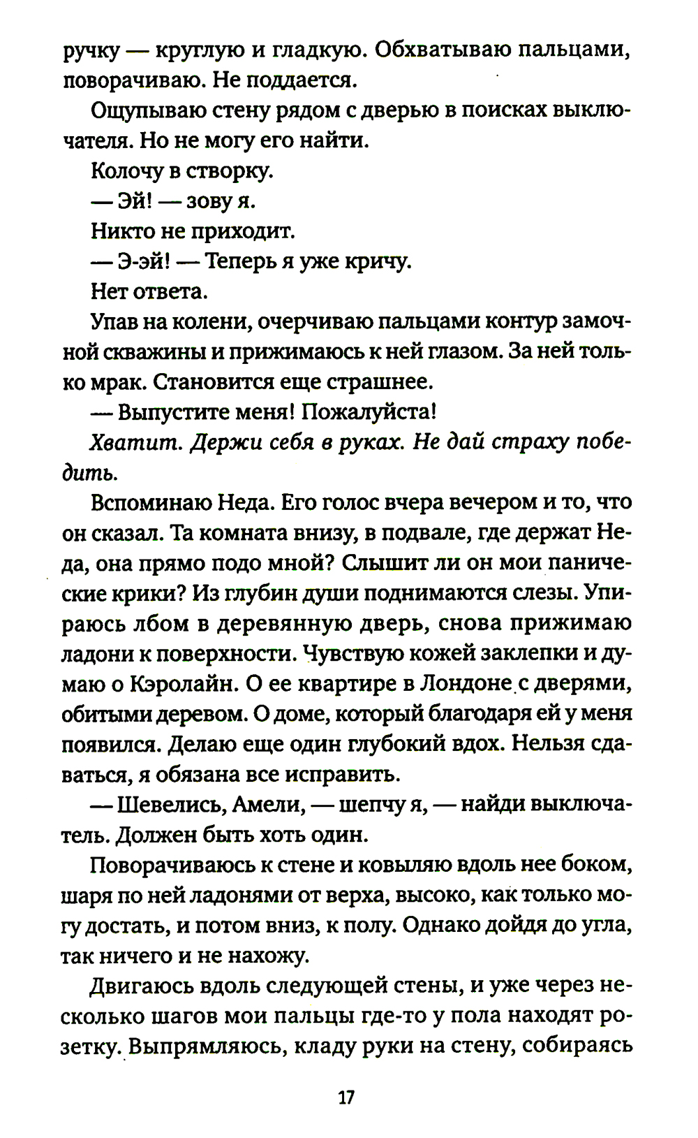 После смерти отца восемнадцатилетняя Амели переезжает в Лондон, чтобы устроиться на работу официанткой и накопить денег на оплату учебы в колледже. Случай сводит ее с управляющим модным журналом обаятельным миллиардером Недом Хоторном, который вскоре после знакомства предлагает Амели... стать его женой. Всего на месяц. После чего они разведутся, она получит сто тысяч фунтов для оплаты обучения, и дальше каждый пойдет своим путем. Изумленная и растерянная, Амели соглашается. ...Через несколько дней она просыпается в темной комнате, не зная, где находится, и не помня, как там оказалась. После безуспешных попыток выбраться Амели понимает, что ее похитили. Но почему? Кто ее таинственные похитители? Что им от нее нужно? Б.Э. Пэрис, автор пользующихся огромной популярностью во всем мире триллеров «За закрытой дверью», «Психотерапевт» и других, возвращается с «новой захватывающей историей, от которой у вас не раз перехватит дыхание» (Daily Mirror).| Издательство | Синдбад |