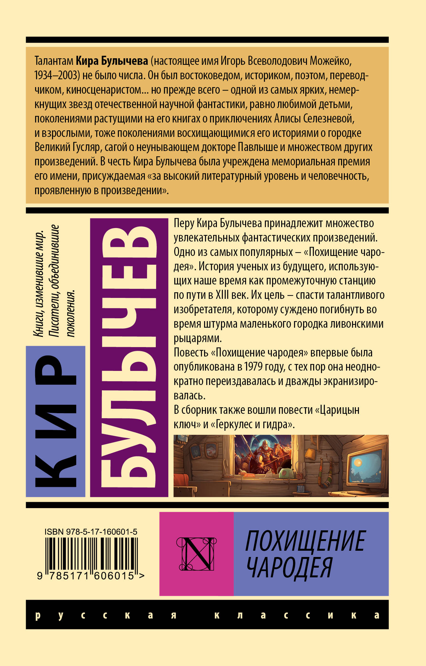 Перу Кира Булычева принадлежит множество увлекательных фантастических произведений. Одно из самых популярных - "Похищение чародея". История ученых из будущего, использующих наше время как промежуточную станцию по пути в XIII век. Их цель - спасти талантливого изобретателя, которому суждено погибнуть во время штурма маленького городка ливонскими рыцарями. Повесть "Похищение чародея" впервые была опубликована в 1979 году, с тех пор она неоднократно переиздавалась и дважды экранизировалась. В сборник также вошли повести "Царицын ключ" и "Геркулес и гидра".| Издательство | Издательство "АСТ" |