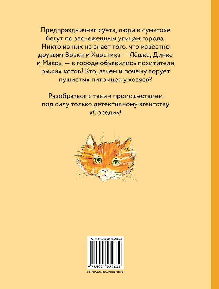 Предпраздничная суета, люди в суматохе бегут по заснеженным улицам города. Никто из них не знает того, что известно друзьям Вовки и Хвостика - Лёшке, Динке и Максу, - в городе объявились похитители рыжих котов! Кто, зачем и почему ворует пушистых питомцев у хозяев? Разобраться с таким происшествием под силу только детективному агентству "Соседи"!| Издательство | Издательский Дом Мещерякова АО |