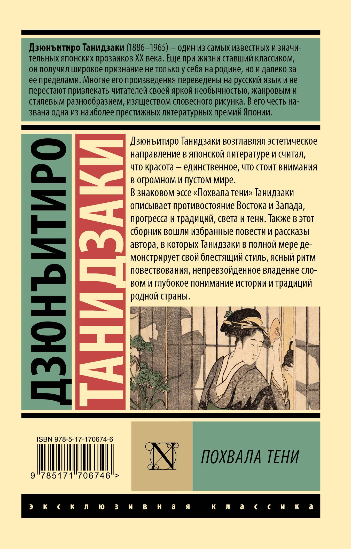 Дзюнъитиро Танидзаки возглавлял эстетическое направление в японской литературе и считал, что красота - единственное, что стоит внимания в огромном и пустом мире. В знаковом эссе "Похвала тени" Танидзаки описывает противостояние Востока и Запада, прогресса и традиций, света и тени. Также в этот сборник вошли избранные повести и рассказы автора, в которых Танидзаки в полной мере демонстрирует свой блестящий стиль, ясный ритм повествования, непревзойденное владение словом и глубокое понимание истории и традиций родной страны.| Издательство | Издательство "АСТ" |
