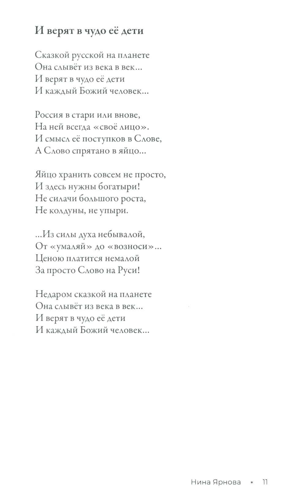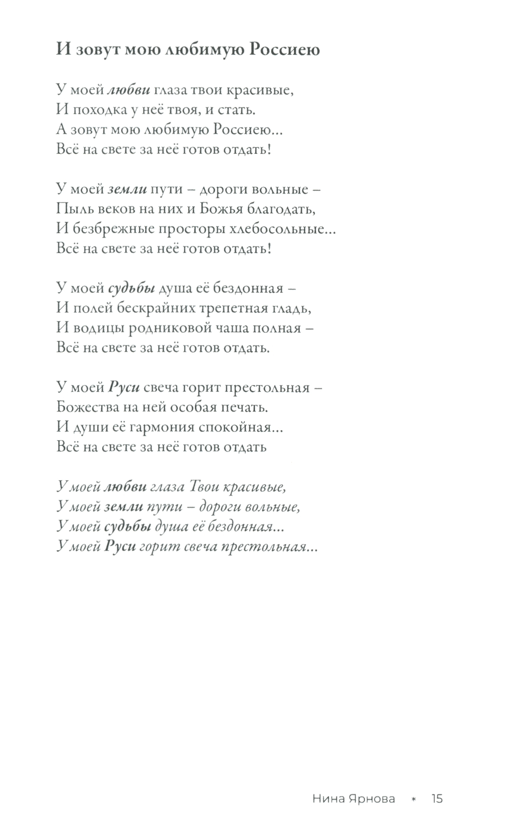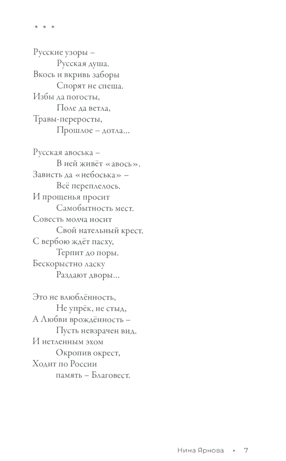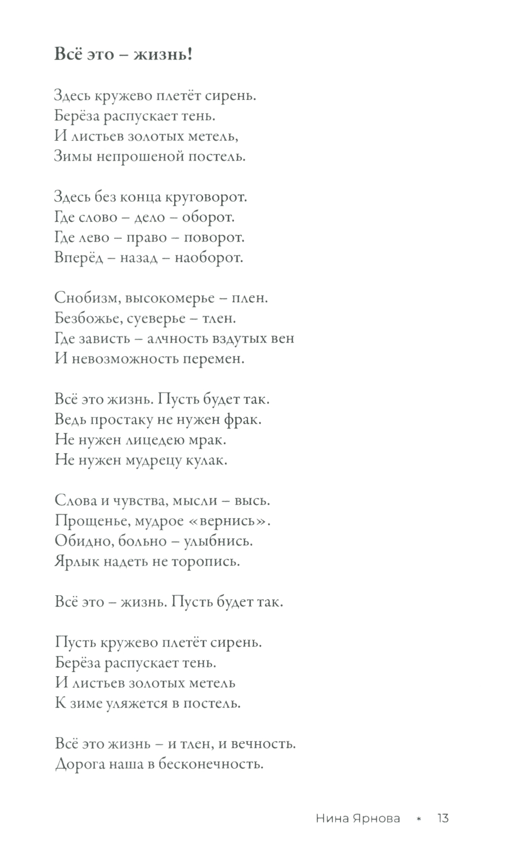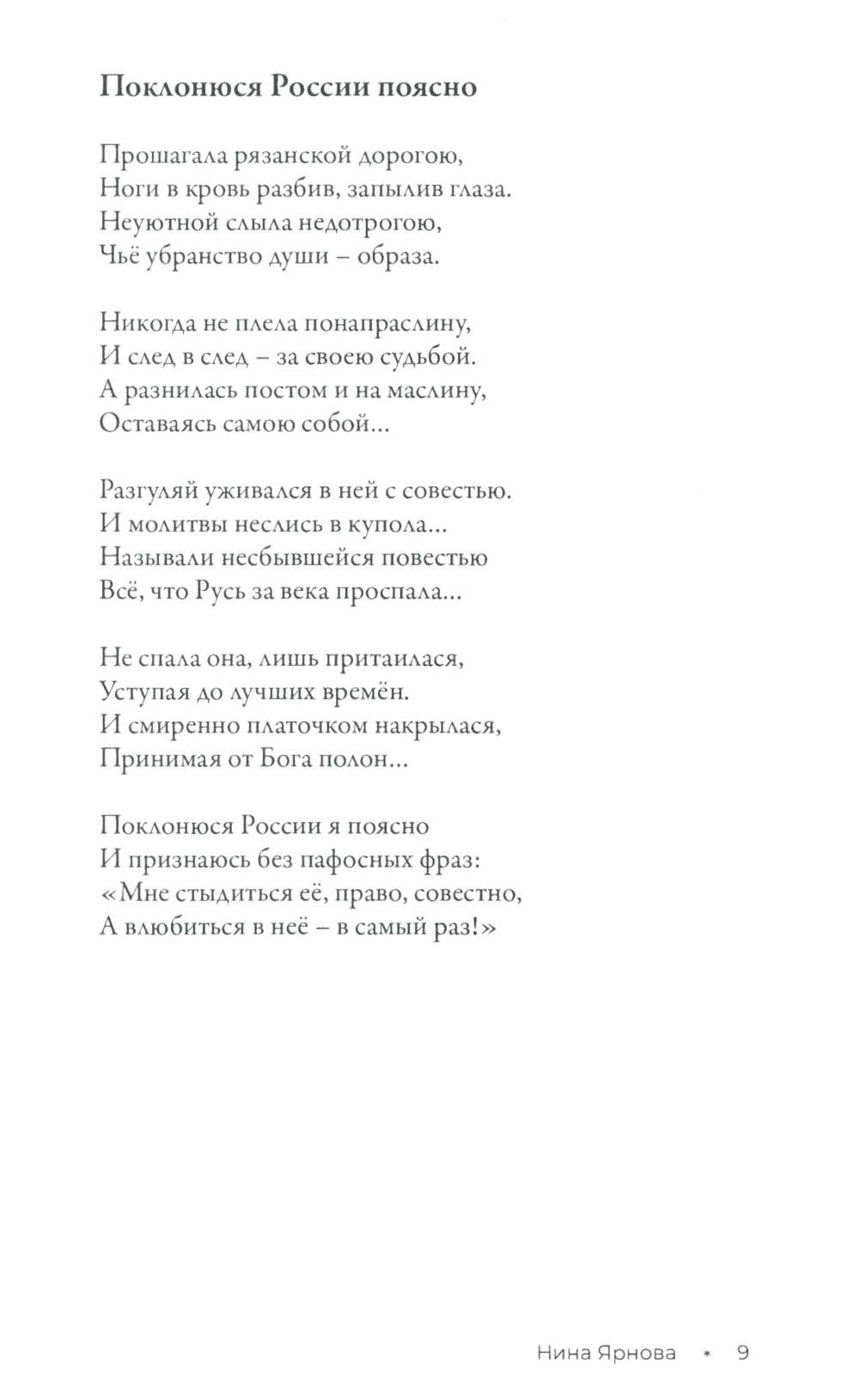 Книга стихотворений Нины Ярновой - это целый мир, противоречивый и зовущий, в котором взлёты и падения, сомнения и надежды. Это - поиск Бога и тернистая, светлая дорога к судьбе. В её стихах - неравнодушное, бережное отношение к родине, людям, вере, доброта и стремление к пониманию смысла жизни. В них - душа России, простая и сложная, глубокая и скромная. Той России, в которой храмы говорят, а сердца внимают.| Издательство | ИПО "У Никитских ворот" |