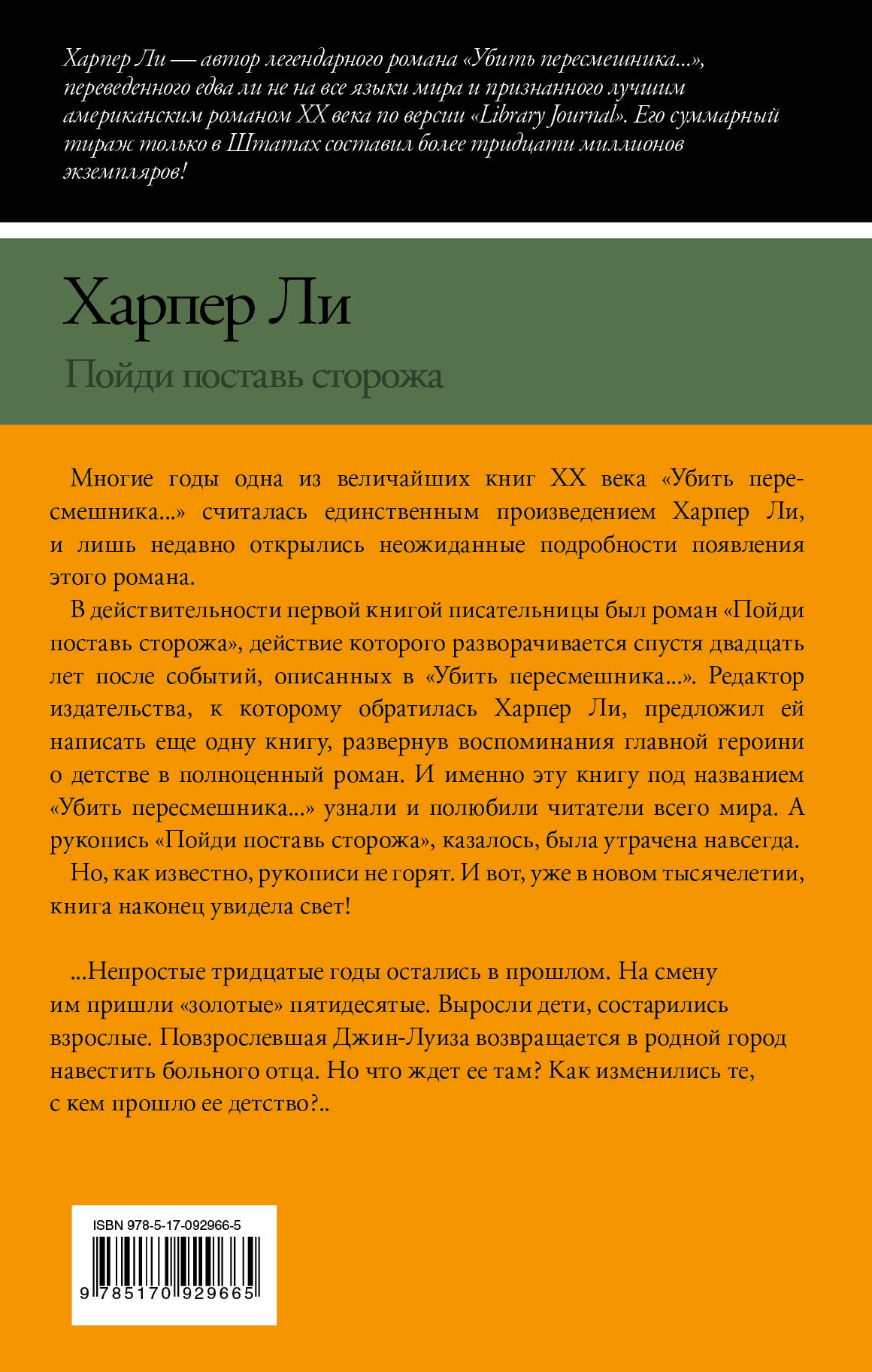 Продолжение легендарного романа Харпер Ли "Убить пересмешника…" …Непростые тридцатые годы остались в прошлом. На смену им пришли "золотые" пятидесятые. Выросли дети, состарились взрослые. Повзрослевшая Джин-Луиза возвращается в родной город навестить больного отца. Но что ждет ее там? Как изменились те, с кем прошло ее детство?..