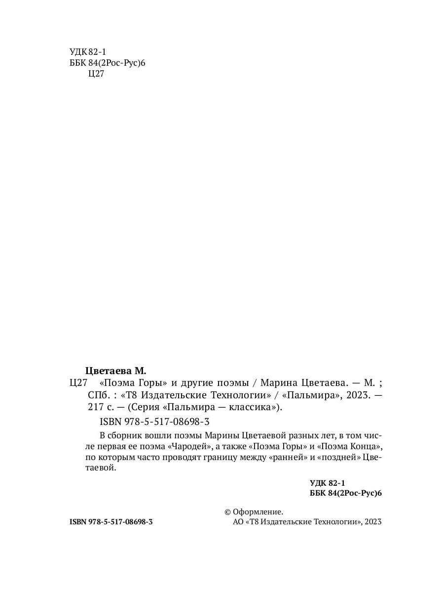 Марина Ивановна Цветаева (1892-1941) - поэт, писатель, драматург, переводчик. Ее творчество стало крупнейшим явлением Серебряного века русской литературы. В сборник вошли пошли поэмы Марины Цветаевой разных лет, в том числе первая ее поэма "Чародей", а также "Поэма Горы" и "Поэма Конца", по которым часто проводят границу между "ранней" и "поздней" Цветаевой.