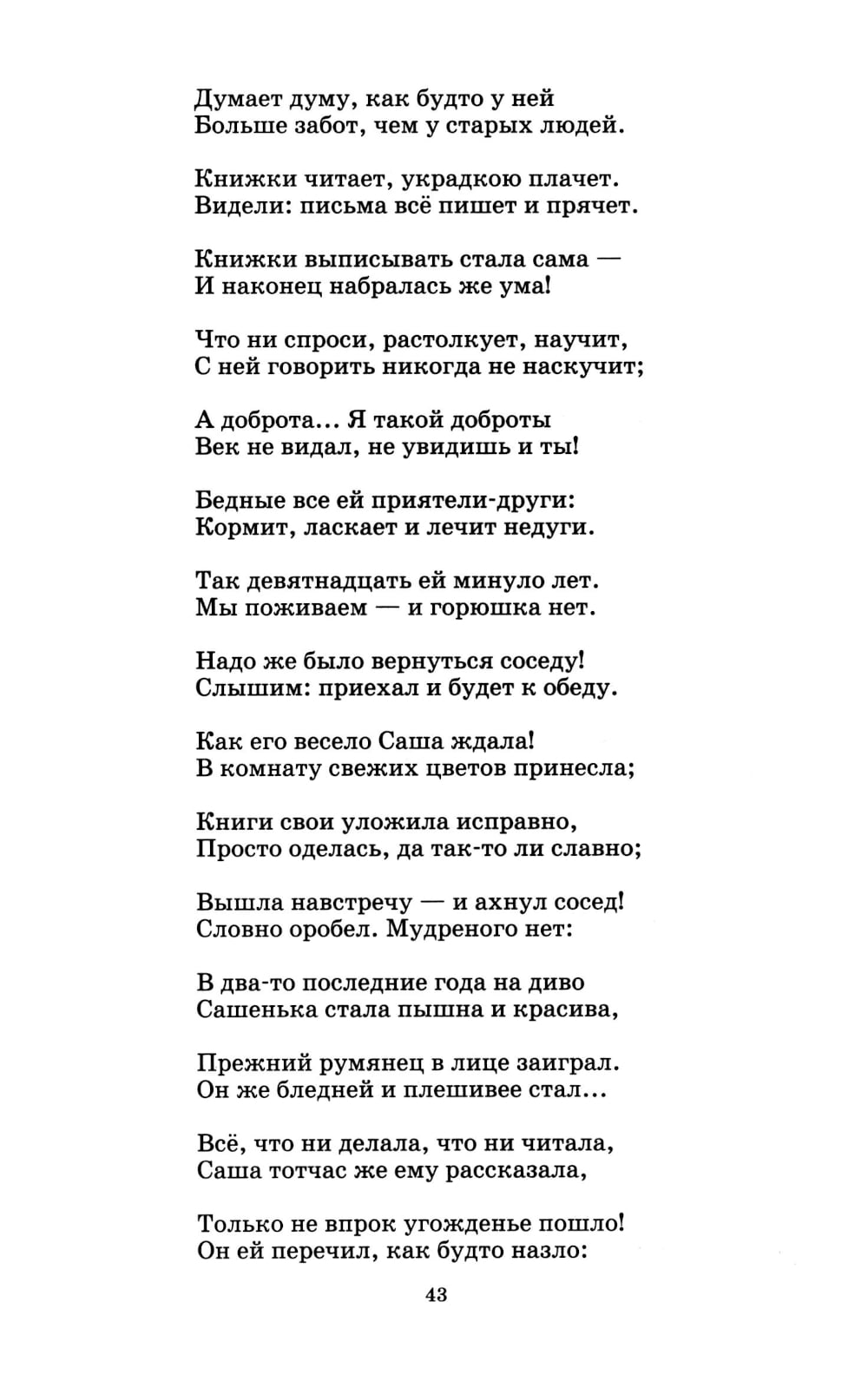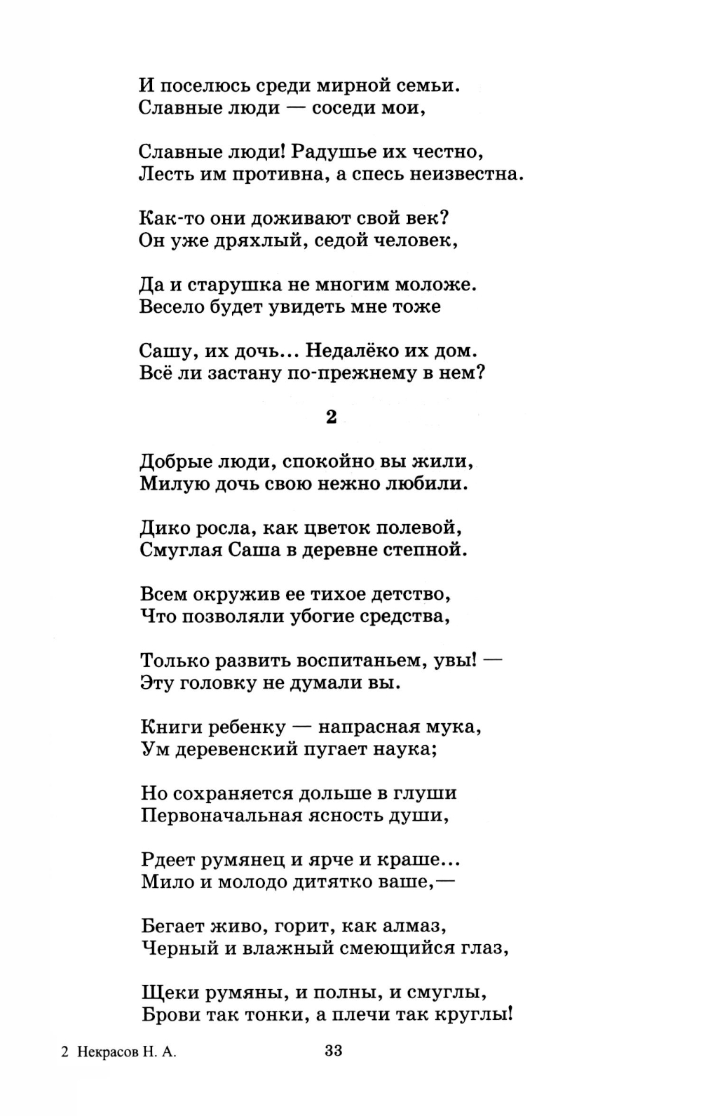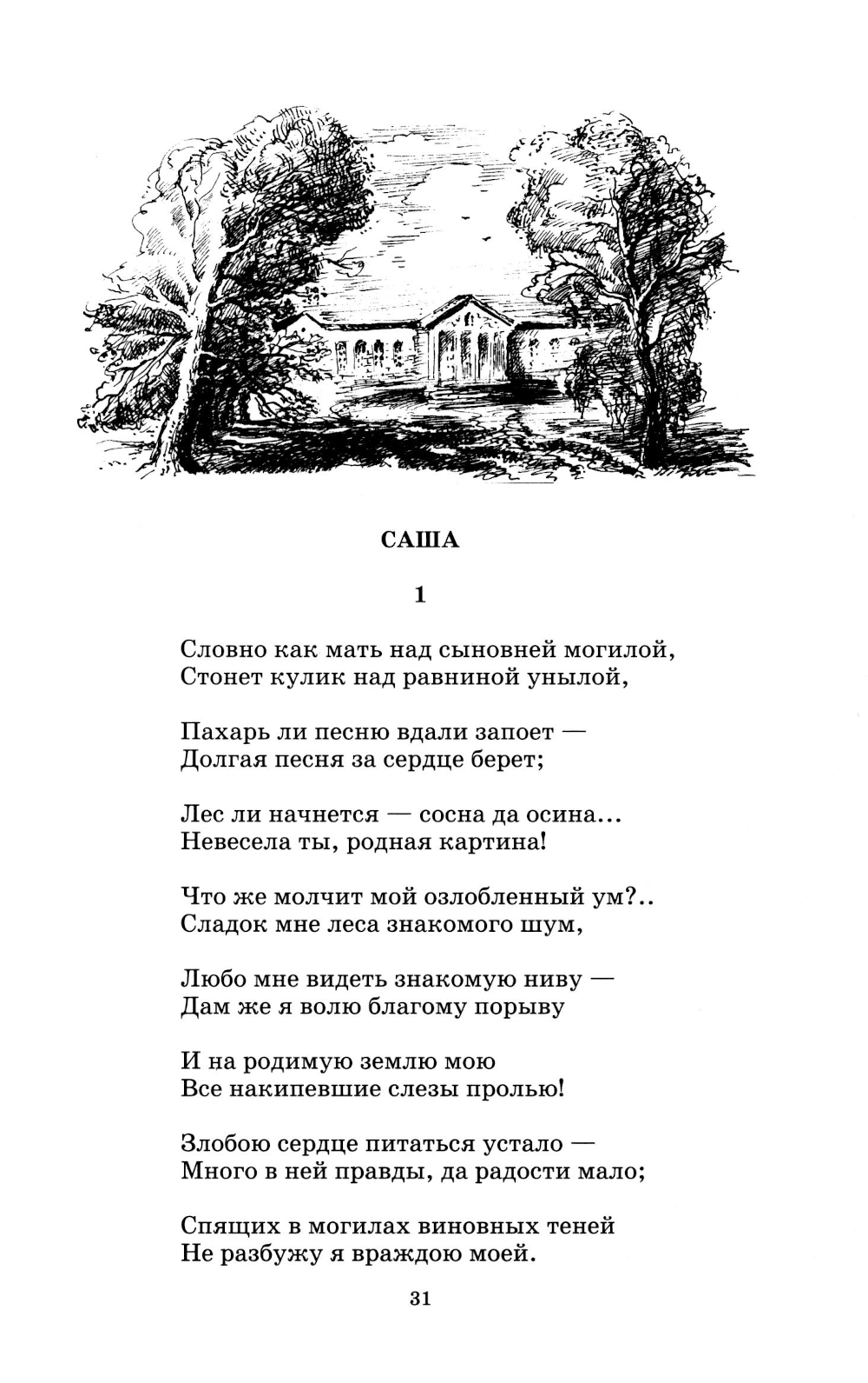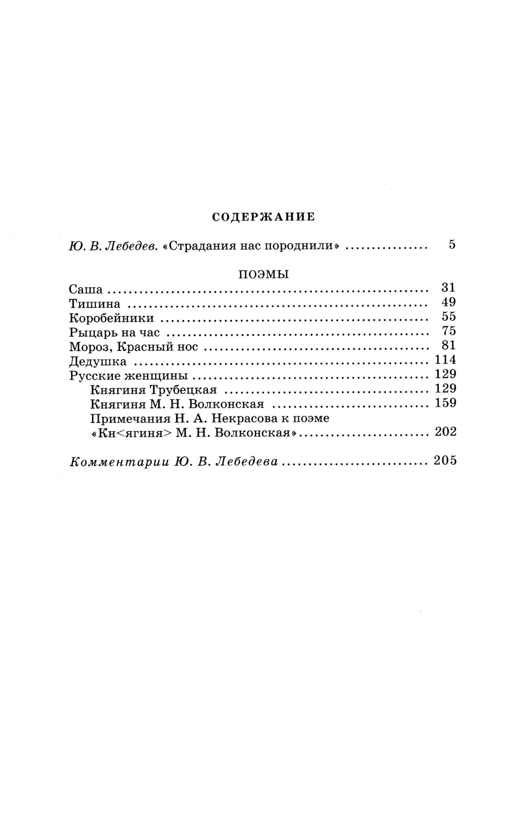 В сборник включены поэмы «Саша», «Коробейники», «Русские женщины» и др. Для старшего школьного возраста. Текст представлен без сокращений, напечатан на хорошей бумаге крупным шрифтом и содержит черно-белые иллюстрации, помогающие создать атмосферу, но не переключающие внимание ребенка.