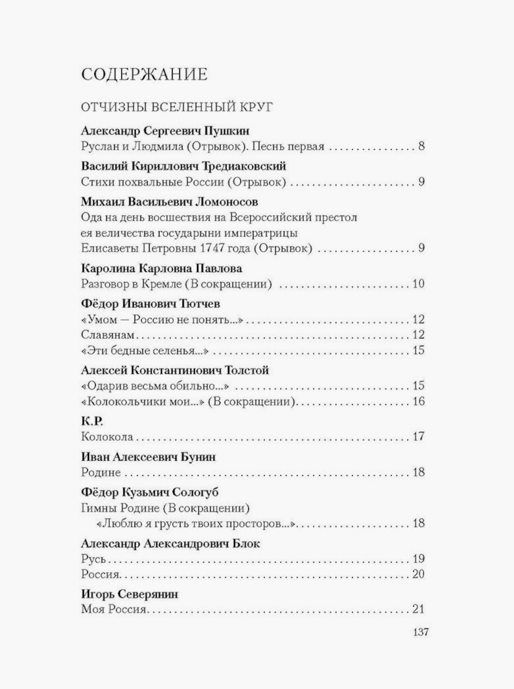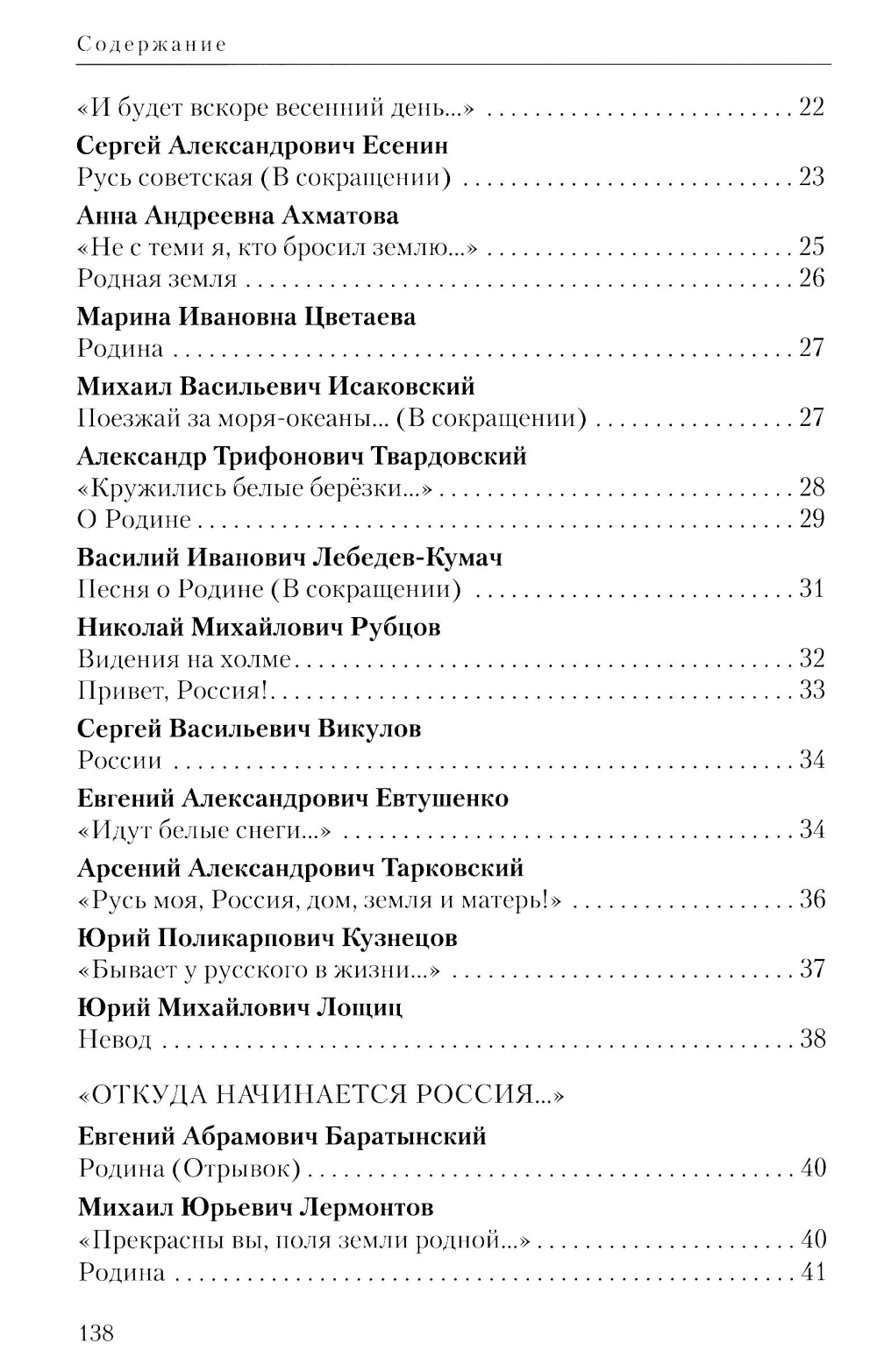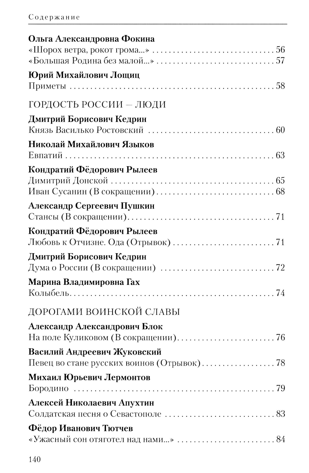 В книге собрано более 100 произведений известных русских поэтов XVIII-XXI веков. От стихотворения к стихотворению выстраивается целостный поэтический образ нашей Родины. Произведения распределены по шести разделам: «Отчизны вселенный круг», «Откуда начинается Россия...», «Гордость России - люди», «Дорогами воинской славы», «Родная природа», «Две столицы России». Они принадлежат перу 60 очень разных поэтов: самых известных и незаслуженно забытых, изучаемых в школе и ещё не вошедших в обязательные программы. Благодаря этому юные читатели получат объёмное представление о том, как тема Родины отражена в русской поэзии и какие мотивы и образы входят в неё. Многообразие поэтических направлений и сердечное звучание стихотворений о родной земле помогут найти каждому своё произведение, которое станет началом большой любви к поэзии.| Издательство | ИД Вахромеева |