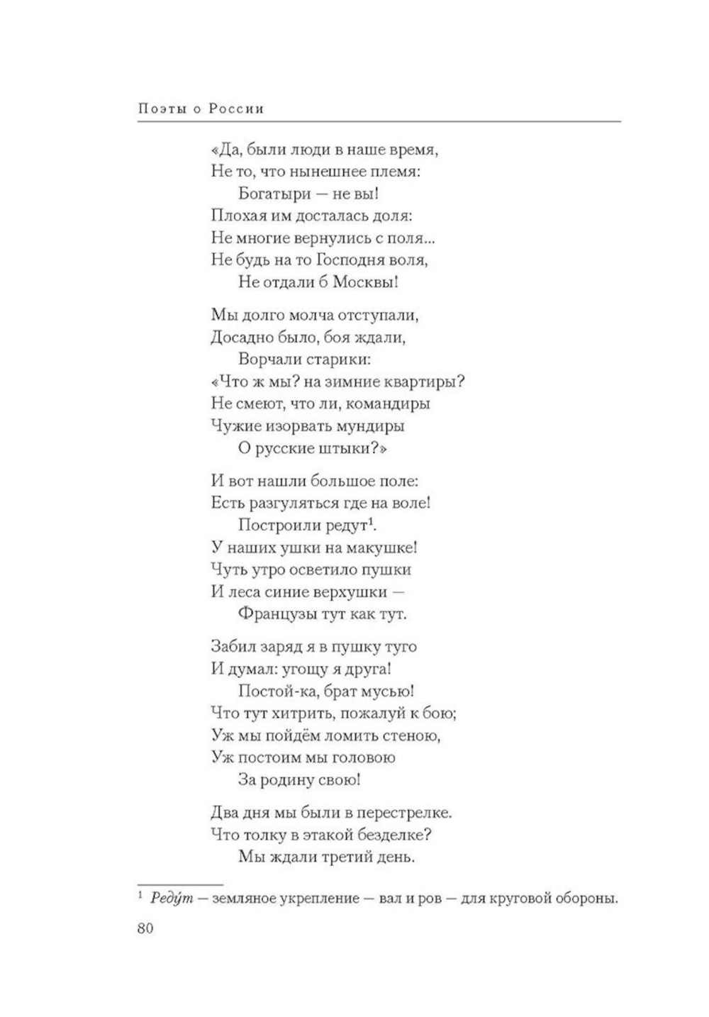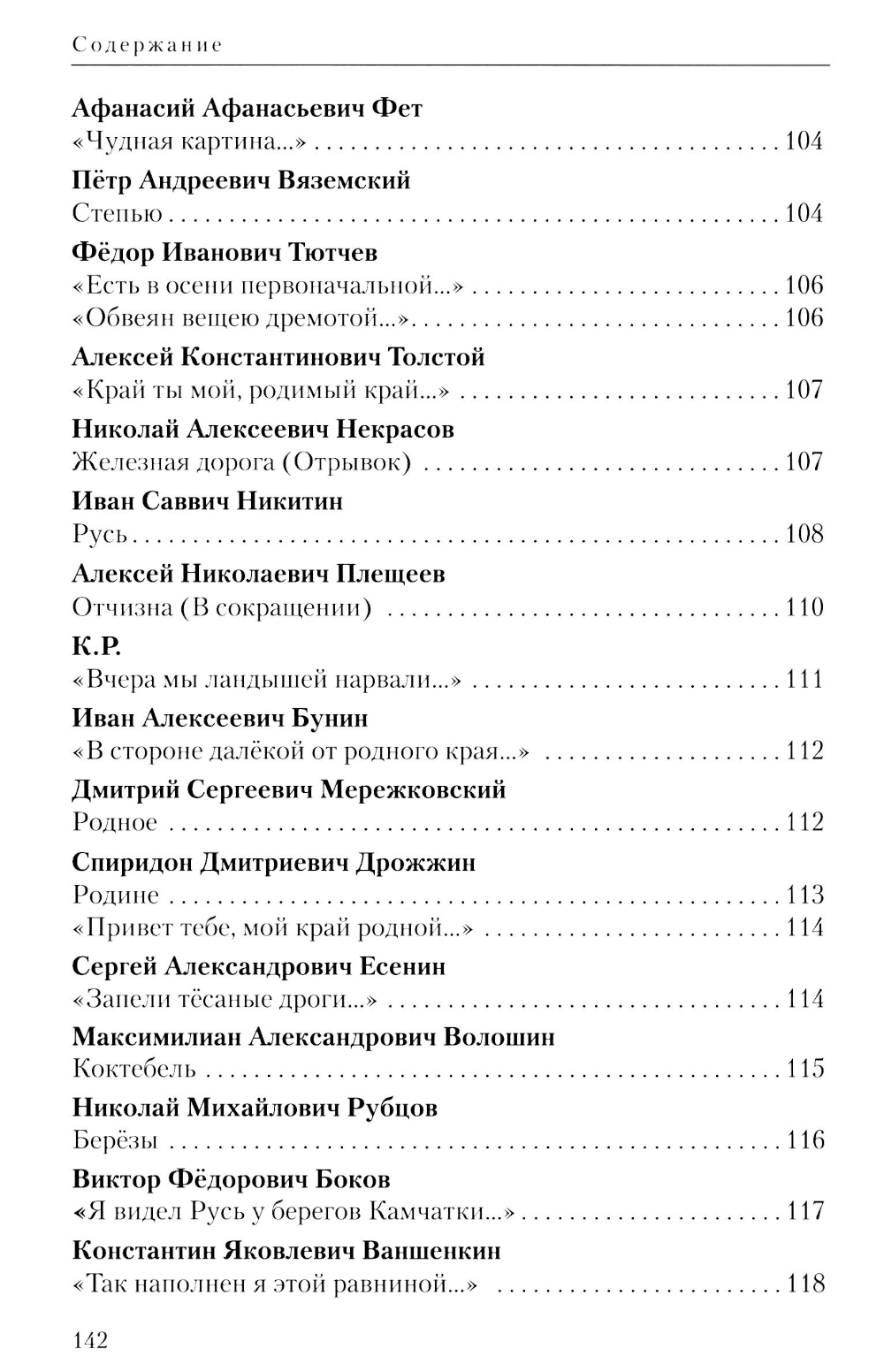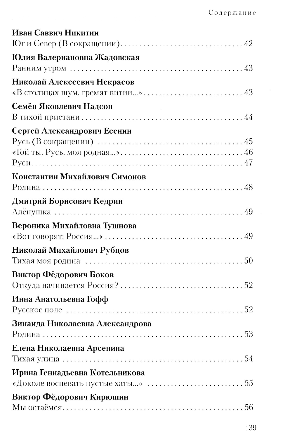 В книге собрано более 100 произведений известных русских поэтов XVIII-XXI веков. От стихотворения к стихотворению выстраивается целостный поэтический образ нашей Родины. Произведения распределены по шести разделам: «Отчизны вселенный круг», «Откуда начинается Россия...», «Гордость России - люди», «Дорогами воинской славы», «Родная природа», «Две столицы России». Они принадлежат перу 60 очень разных поэтов: самых известных и незаслуженно забытых, изучаемых в школе и ещё не вошедших в обязательные программы. Благодаря этому юные читатели получат объёмное представление о том, как тема Родины отражена в русской поэзии и какие мотивы и образы входят в неё. Многообразие поэтических направлений и сердечное звучание стихотворений о родной земле помогут найти каждому своё произведение, которое станет началом большой любви к поэзии.| Издательство | ИД Вахромеева |
